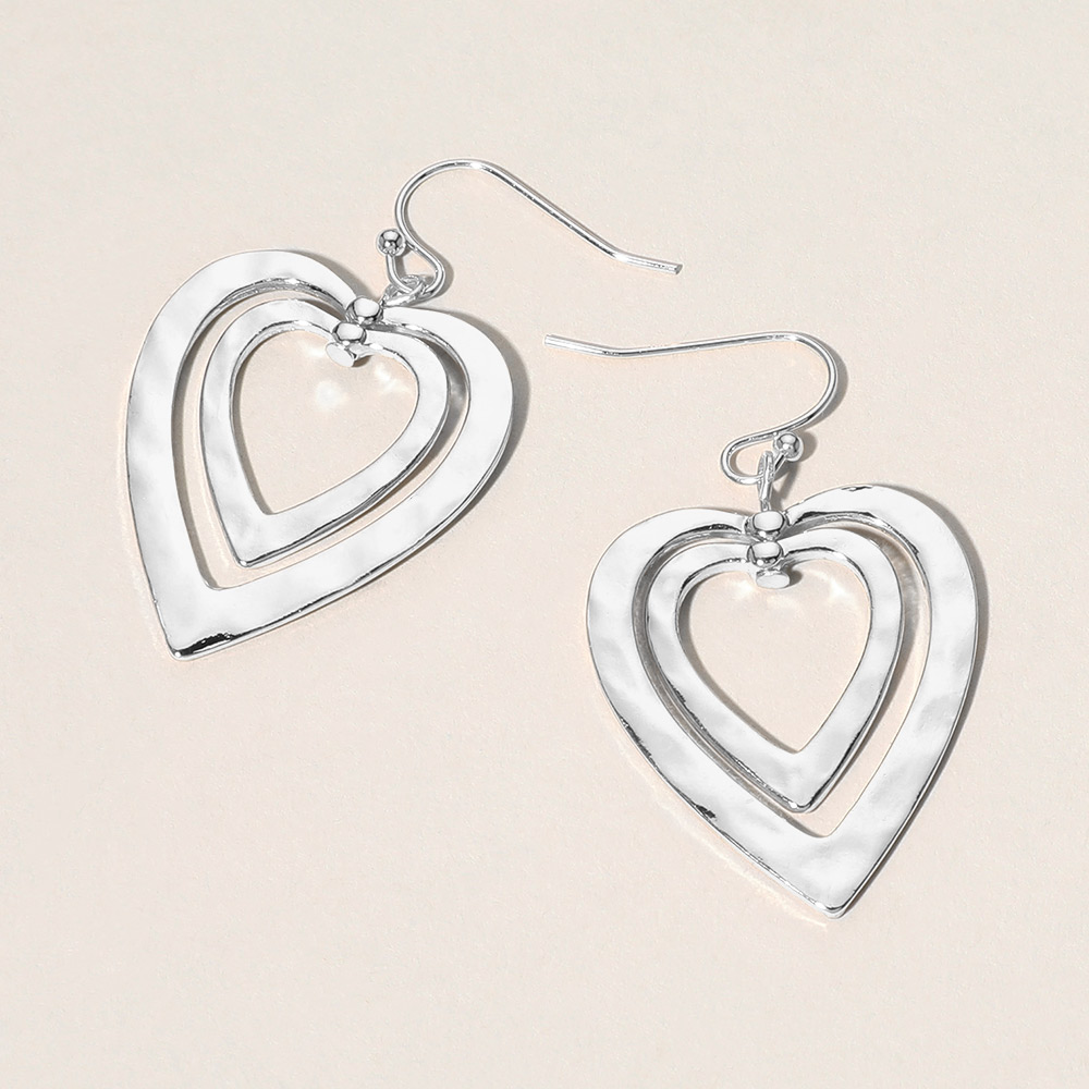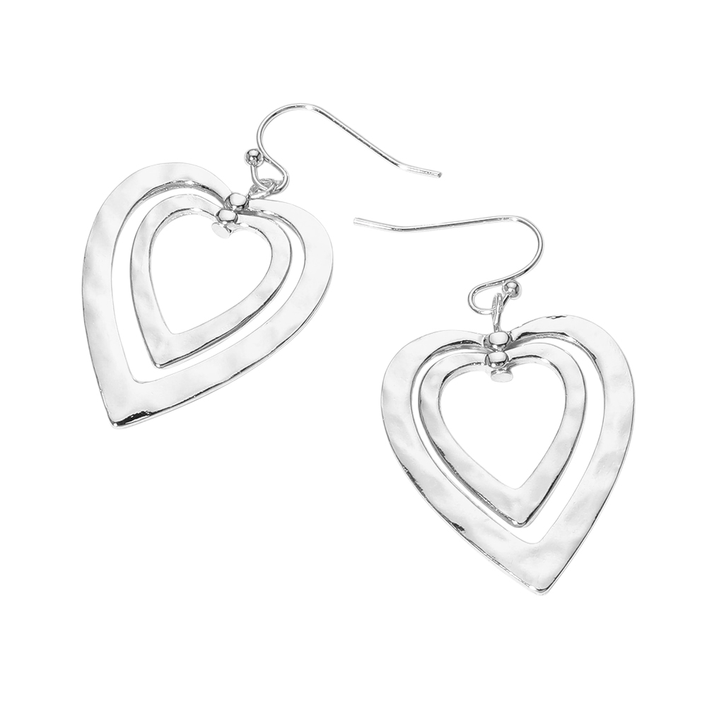 Hammered Metal Double Open Heart Layered Dangle Earrings