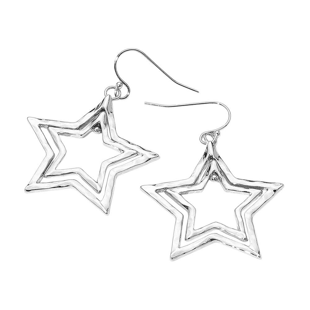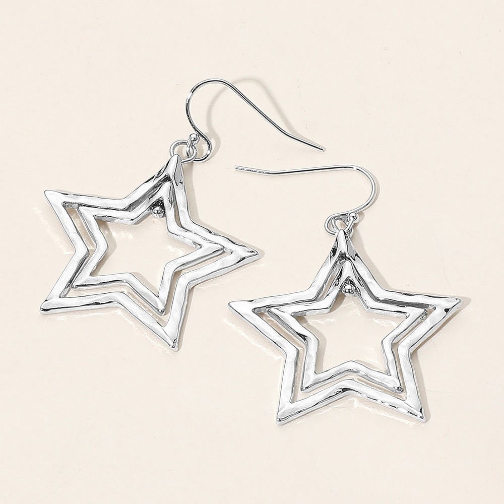 Details • Size : 1.4" X 1.8" • Fish Hook Back • Add celestial charm to your outfit with double star drop earrings. Featuring an open star outline within a larger star, they bring playful movement and bold flair to any look, from daywear to evening events. • Lead and Nickel Compliant