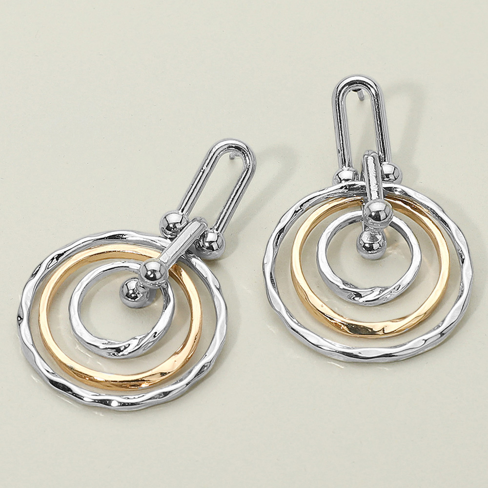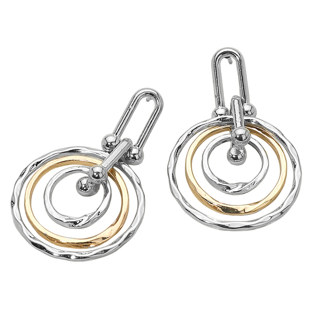 • Chic layered spiral hoop drop earrings featuring interlocking circular loops with a hammered finish for added texture. Their modern geometric design and dangling movement make them a standout accessory, perfect for dressing up casual outfits or completing elegant evening looks.