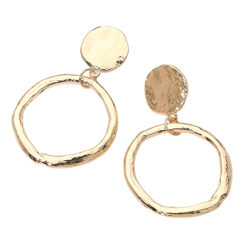 Details • Size : 1.6" X 2.5" • Post Back • Hammered circle drop earrings feature a textured round stud paired with an open hoop silhouette for modern movement and eye-catching style. Designed to complement casual outfits or elevated looks, they deliver bold impact with versatile appeal for everyday wear or special occasions. • Lead and Nickel Compliant