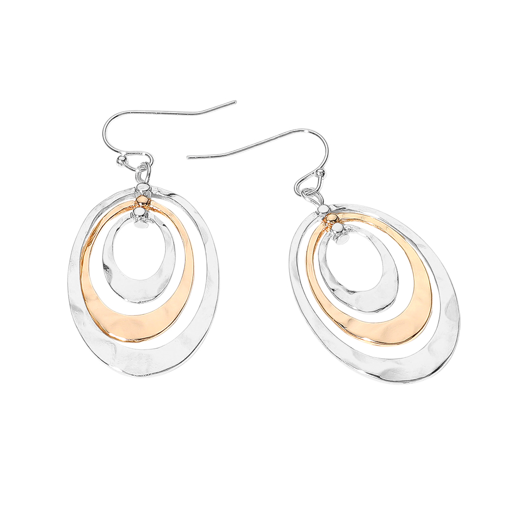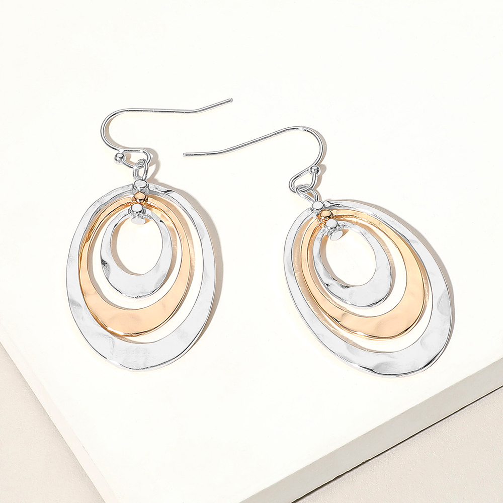 Hammered Metal Triple Open Oval Layered Dangle Earrings