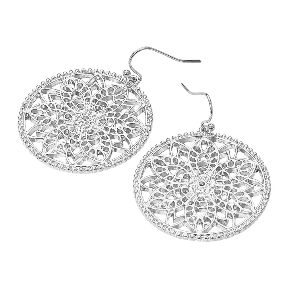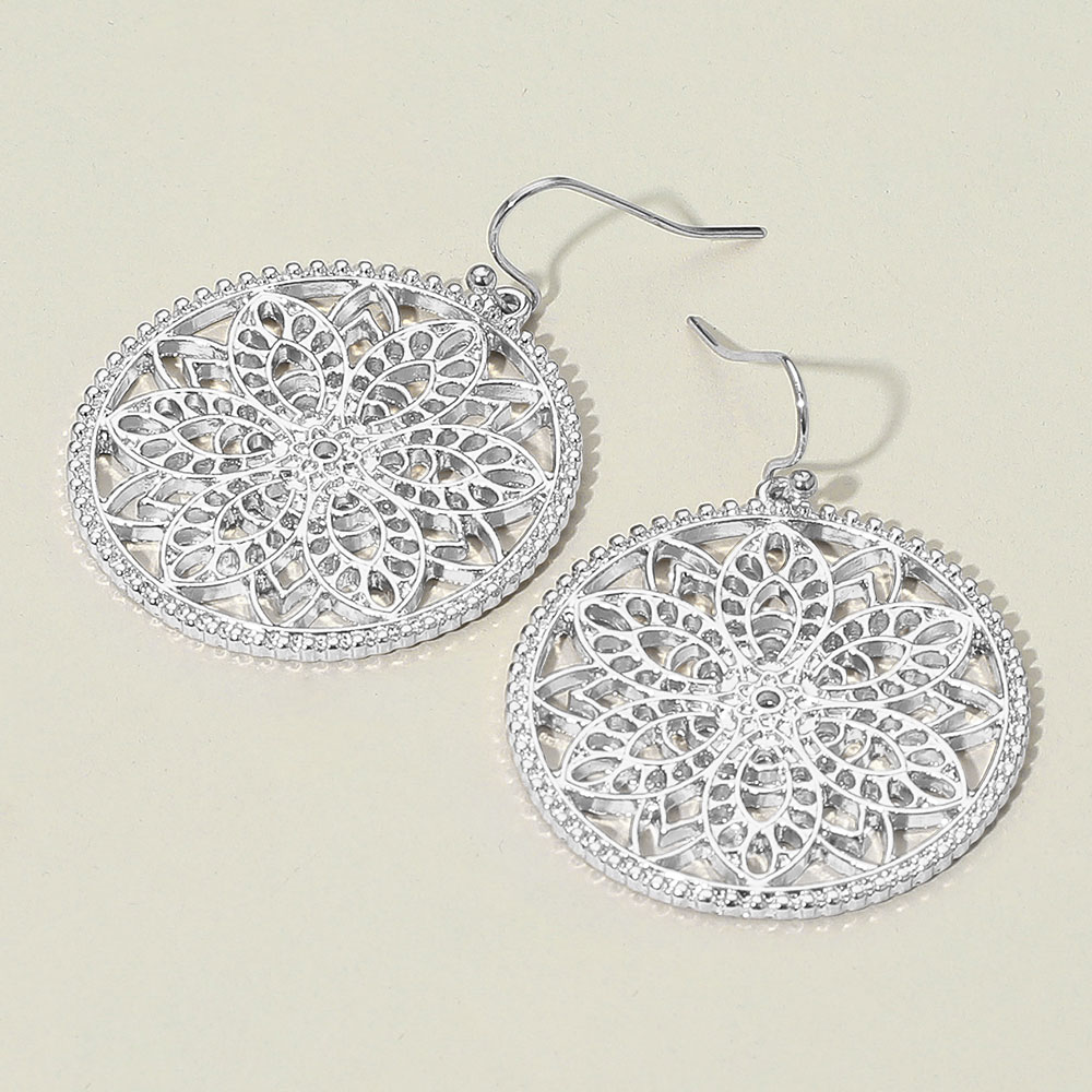 Details • Size : 1.4" X 1.75" • Fish Hook Back • Elegant filigree mandala drop earrings with a detailed openwork design that adds sophistication and charm. Lightweight yet striking, these earrings offer a timeless look, perfect for elevating casual styles or adding refinement to formal outfits. • Lead and Nickel Compliant