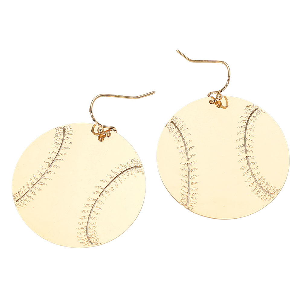 Details • Size : 1.5" X 1.8" • Fish Hook Back • Sporty round dangle earrings featuring an engraved baseball stitch pattern, perfect for gameday outfits and fan-inspired looks. Lightweight statement style adds fun sports flair to everyday wear or team events, making them an ideal accessory for baseball lovers. • Brass • Lead and Nickel Compliant