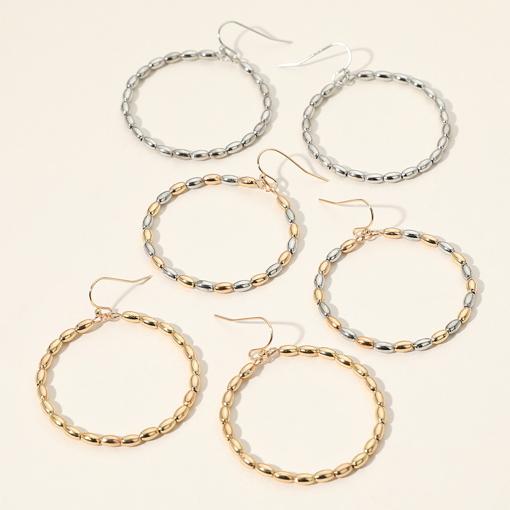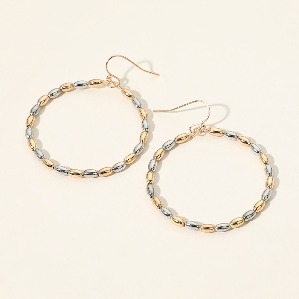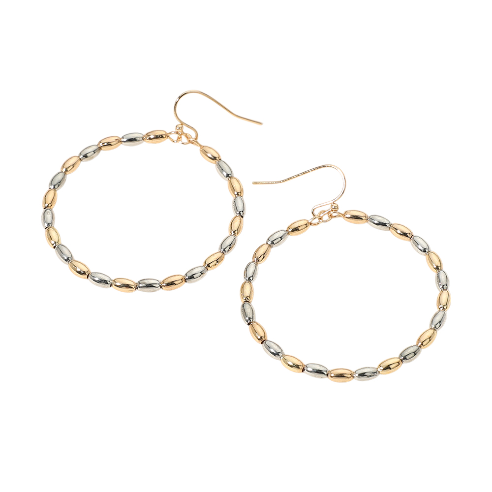 Details • Size : 1.7" X 2.1" • Fish Hook Back • These beaded hoop earrings feature a full circle of oval-textured beads for a refined yet effortless look. Lightweight and stylish, they add a touch of elegance to everyday outfits or evening ensembles. • Lead and Nickel Compliant