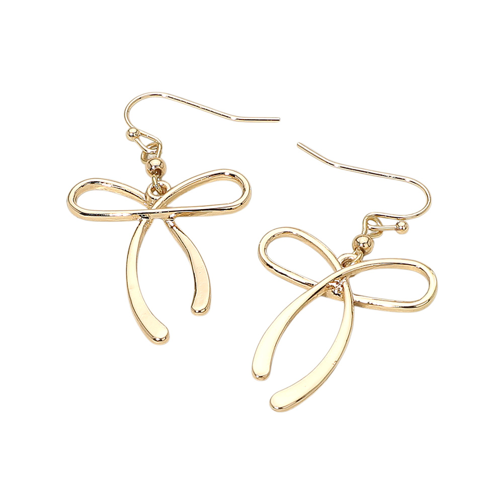 Details • Size : 1" X 1.75" • Fish Hook Back • Delicate open bow drop earrings with a minimalist wireframe design that exudes elegance and charm. Lightweight and versatile, these earrings add a touch of playful sophistication, making them a perfect choice for both casual outings and special occasions. • Lead and Nickel Compliant