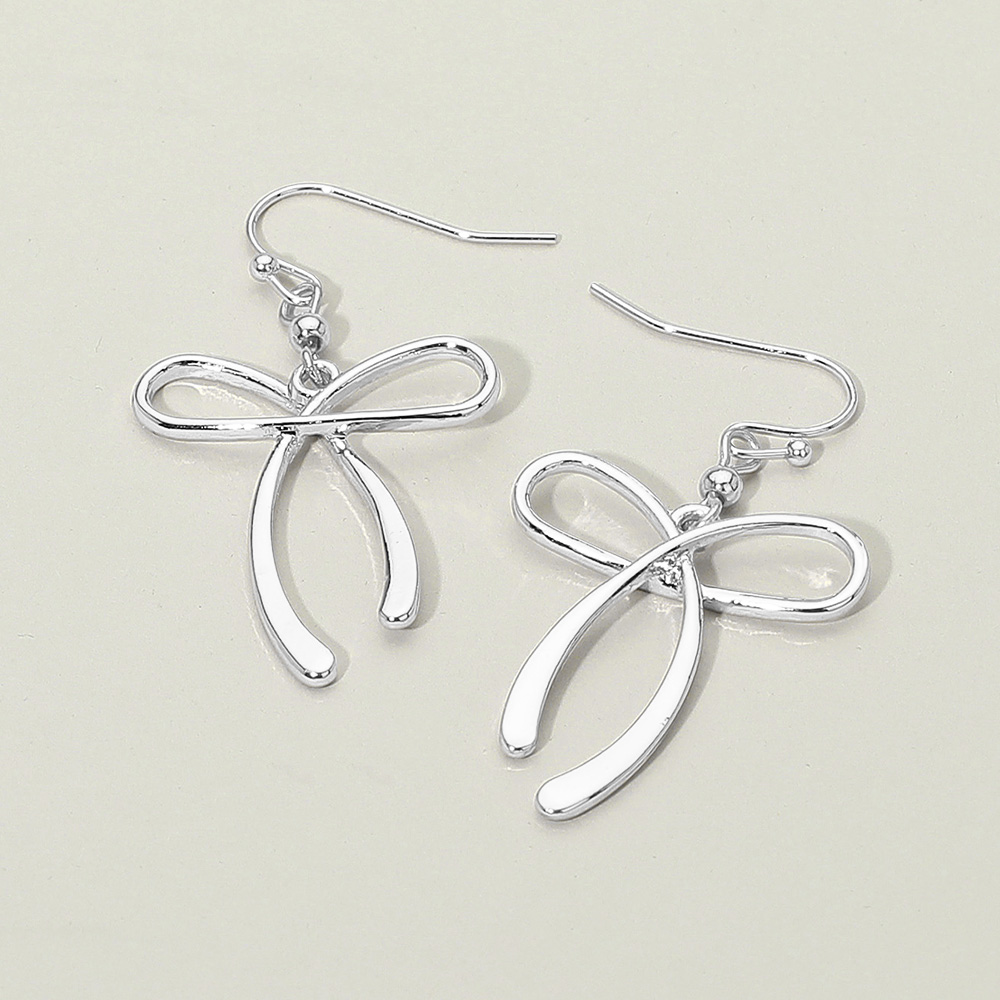 Details • Size : 1" X 1.75" • Fish Hook Back • Delicate open bow drop earrings with a minimalist wireframe design that exudes elegance and charm. Lightweight and versatile, these earrings add a touch of playful sophistication, making them a perfect choice for both casual outings and special occasions. • Lead and Nickel Compliant