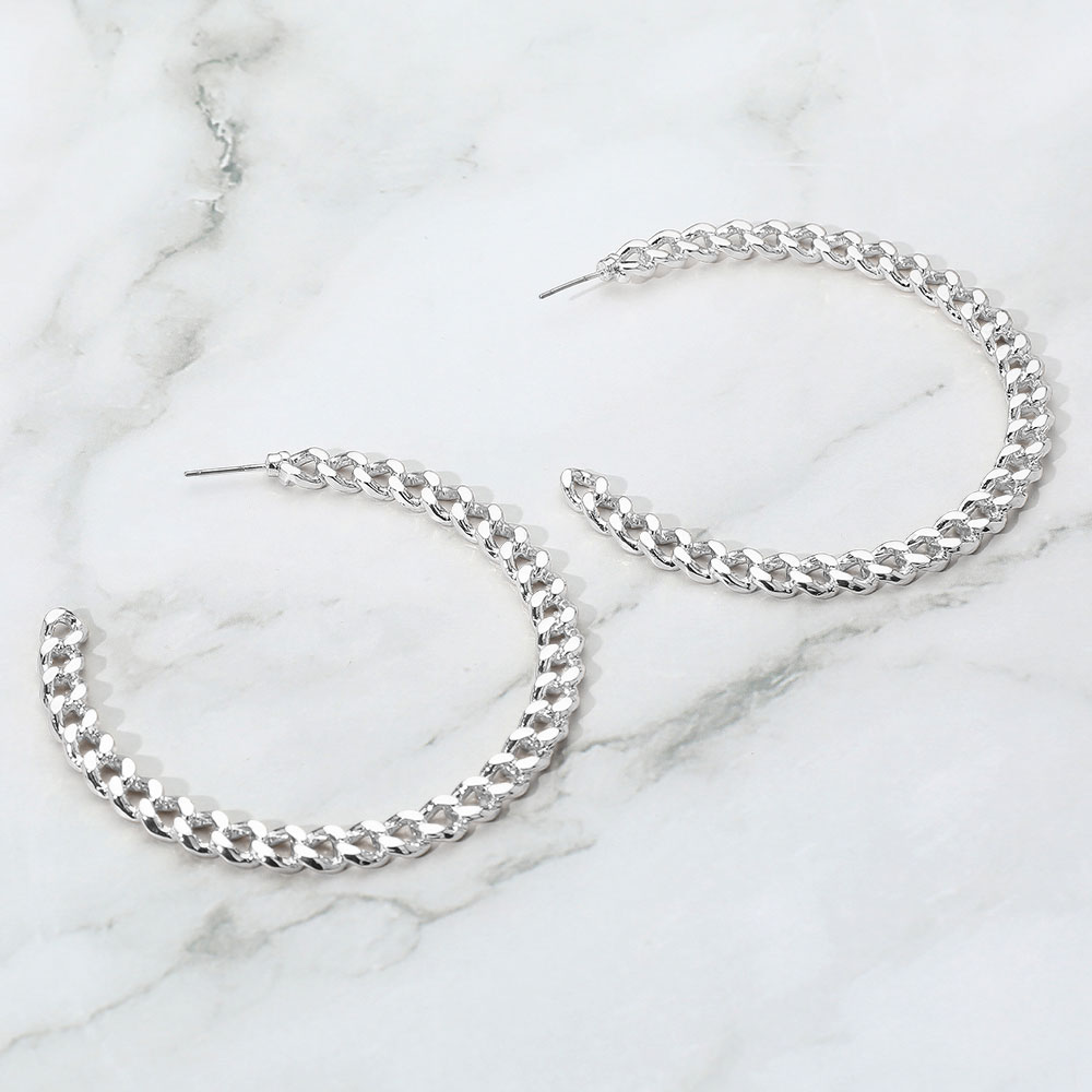 • Add bold elegance to your look with sleek chain hoop earrings. Featuring a polished chain-link design, these hoops offer modern style that transitions effortlessly from casual wear to evening outfits. A versatile accessory that delivers statement appeal and contemporary sophistication.