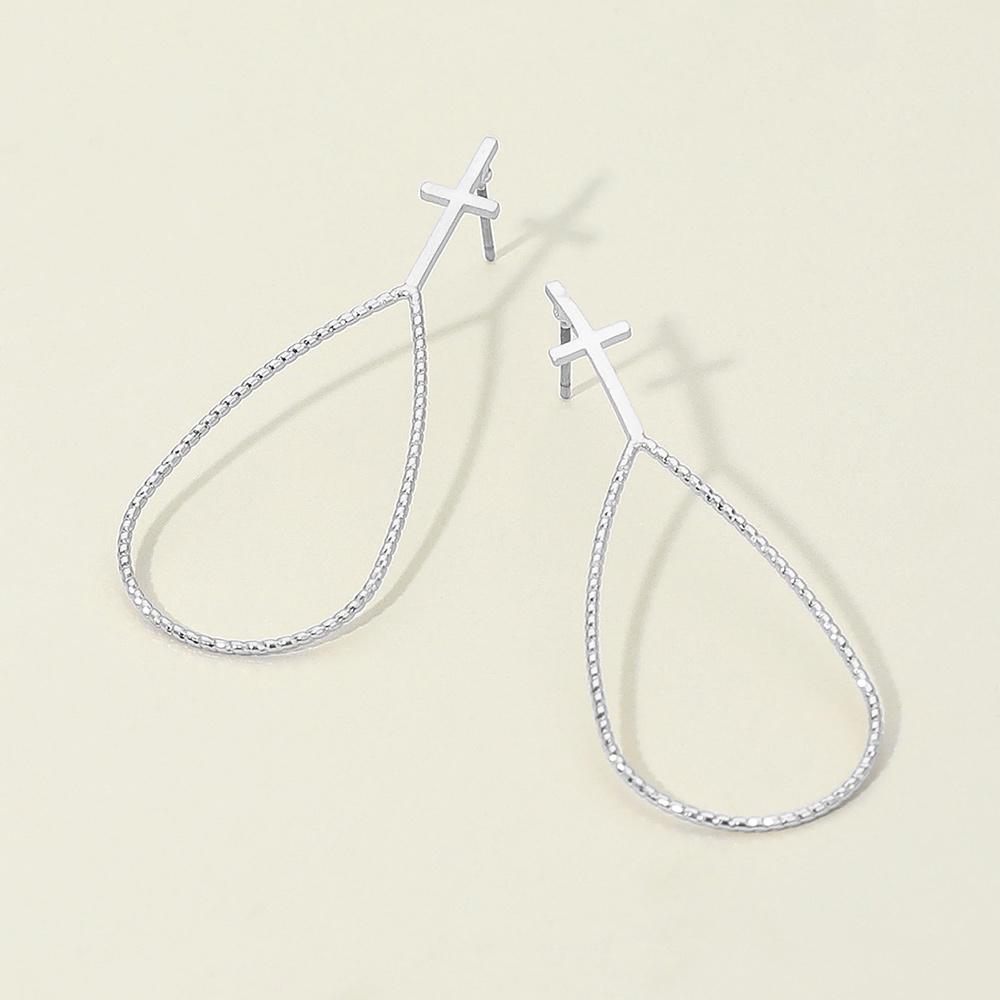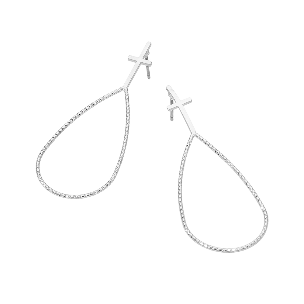 Details • Size : 0.75" X 2" • Post Back • Make a bold statement with these cross drop hoop earrings featuring a sleek teardrop outline. Lightweight and stylish, they combine modern design with symbolic detail, perfect for everyday wear or special occasions. A versatile accessory that adds elegance and meaning to your jewelry collection. • Lead and Nickel Compliant