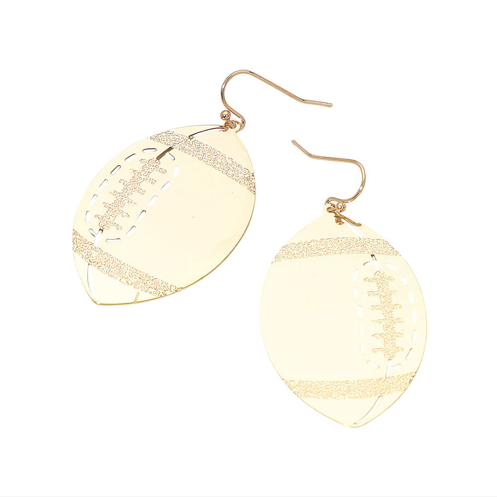 Details • Size : 1.25" X 2.3" • Fish Hook Back • Show your team spirit in style with these football cutout dangle earrings. Designed with a sleek openwork pattern that highlights the iconic ball shape, they bring a sporty yet chic vibe to your outfit. Perfect for game days, tailgates, or gifting to any football enthusiast. • Lead and Nickel Compliant • Brass