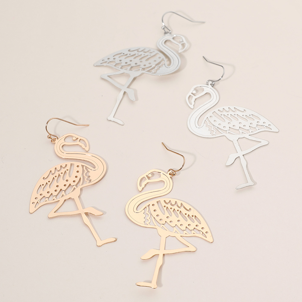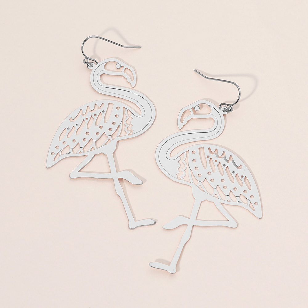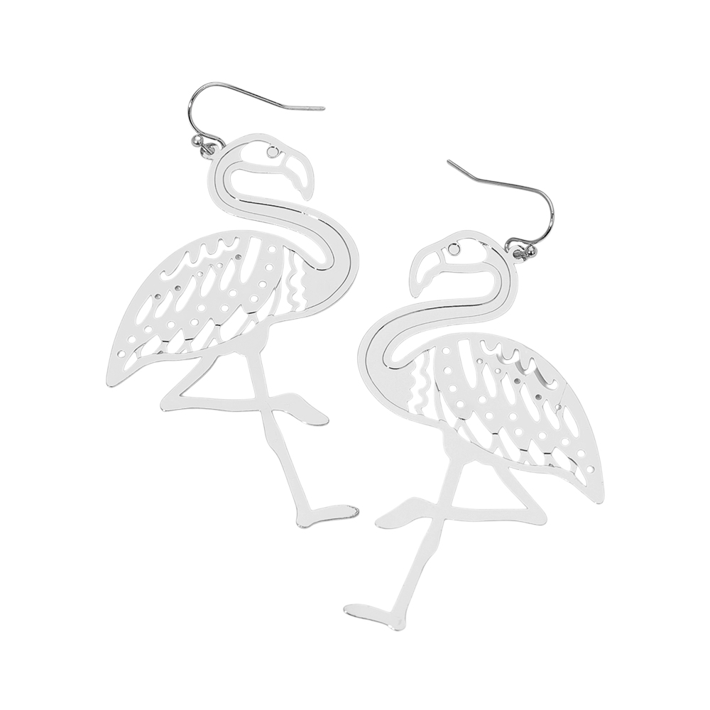 Details • Size : 1.75" X 3" • Fish Hook Back • Show off your playful side with these flamingo silhouette drop earrings, crafted with lightweight metal for comfortable wear. Ideal for beach days, vacations, or adding a quirky touch to casual looks, these earrings bring tropical charm to any outfit. • Lead and Nickel Compliant • Brass