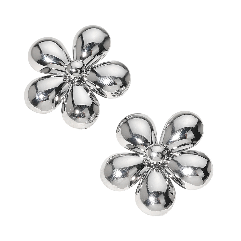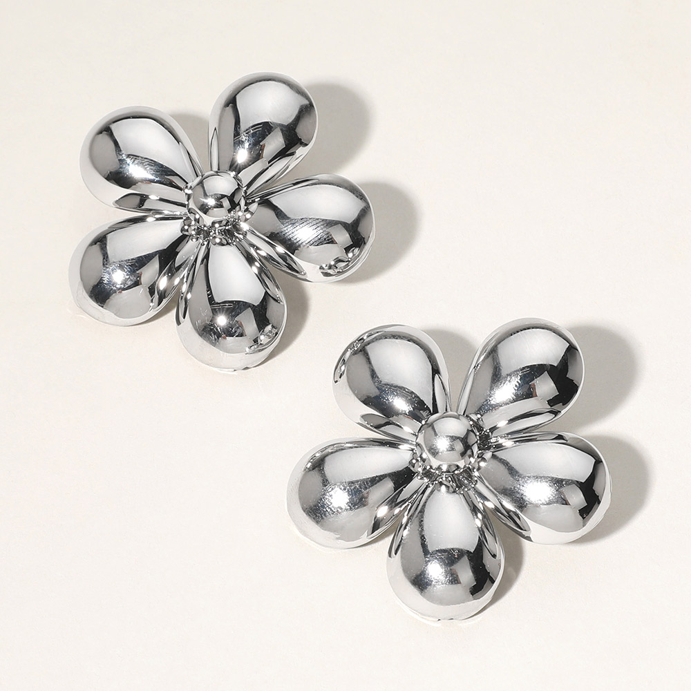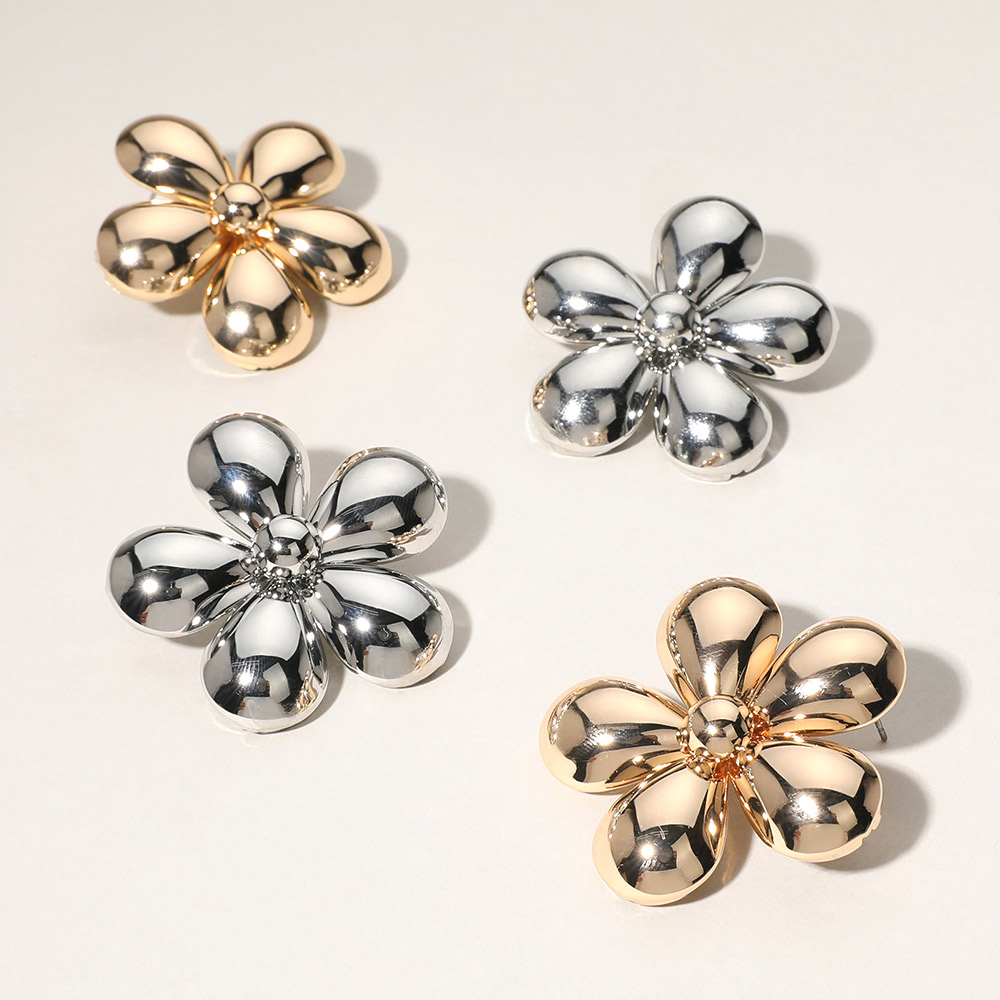 Details • Size : 1.7" X 1.7" • Post Back • Add sculptural flair with these bold floral stud earrings featuring a dimensional petal silhouette. Their reflective surface and rounded form create a statement piece that’s perfect for special occasions or everyday looks needing a fresh, stylish accent. • Lead and Nickel Compliant
