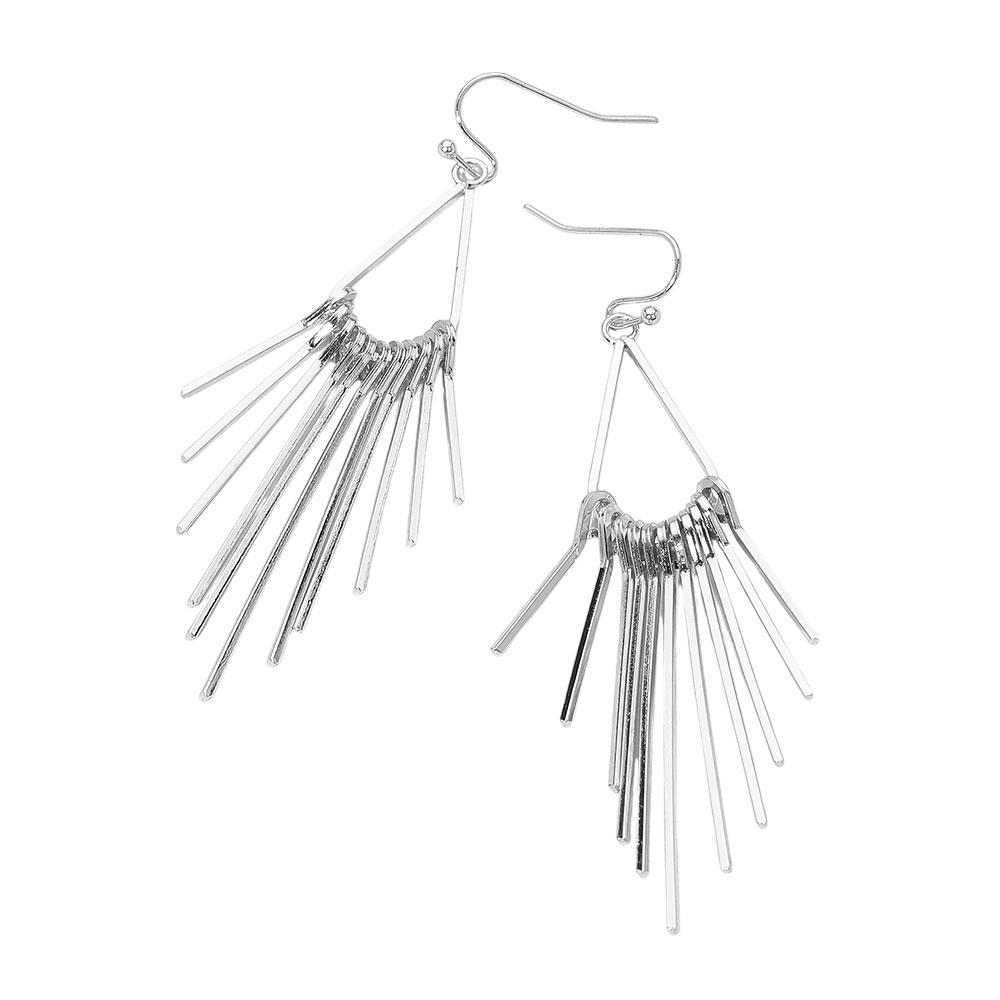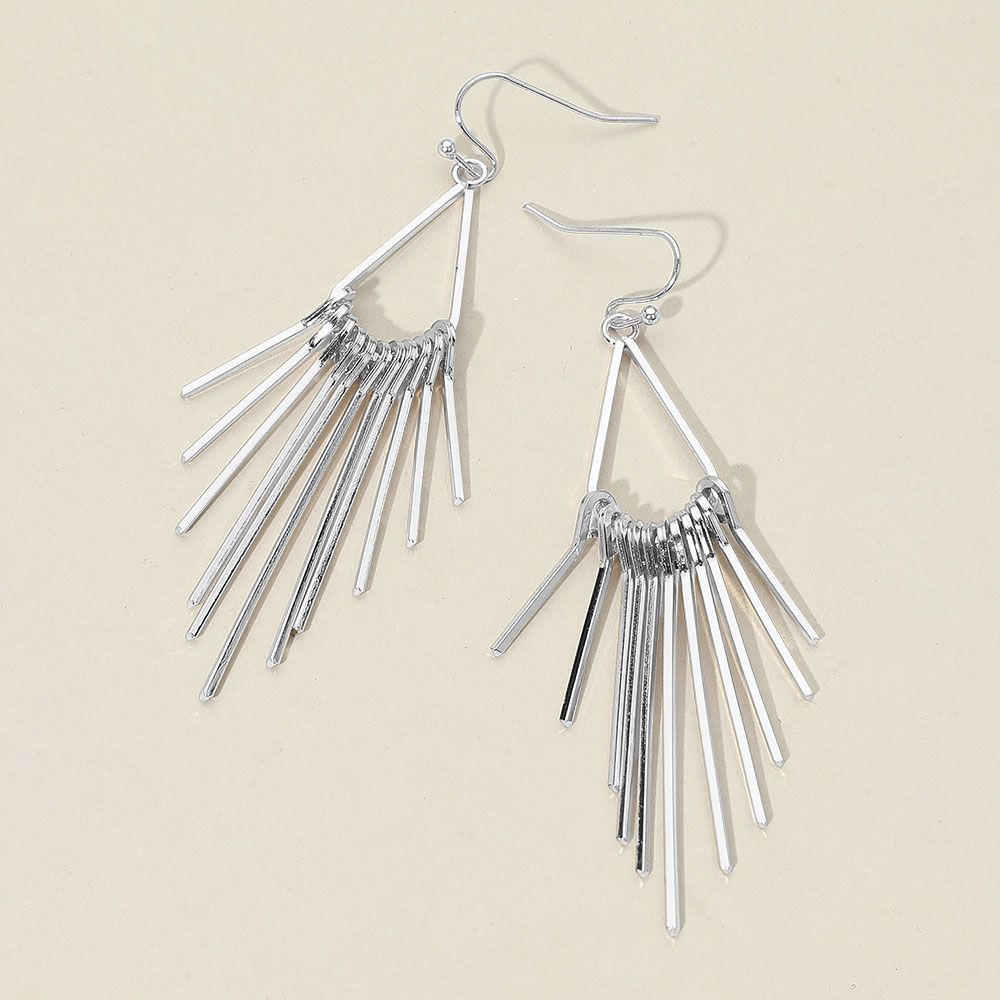 Details • Size : 0.6" X 3.1" • Fish Hook Back • Add a modern edge to your look with these geometric fan tassel drop earrings. Designed with sleek metal rods in a layered fan shape, they deliver movement, shine, and contemporary flair to any outfit. • Lead and Nickel Compliant