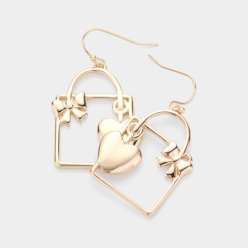 Metal Heart Ribbon Gift Box Dangle Earrings