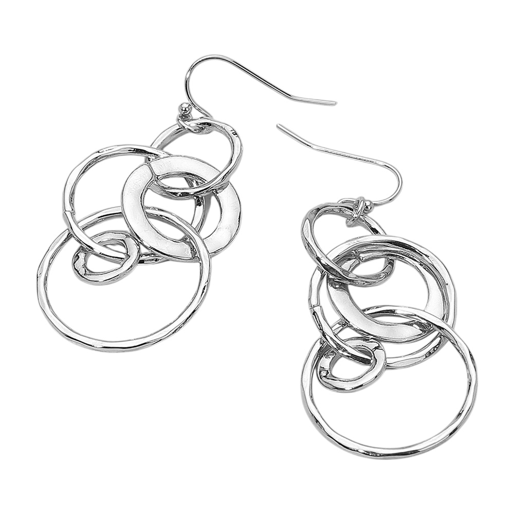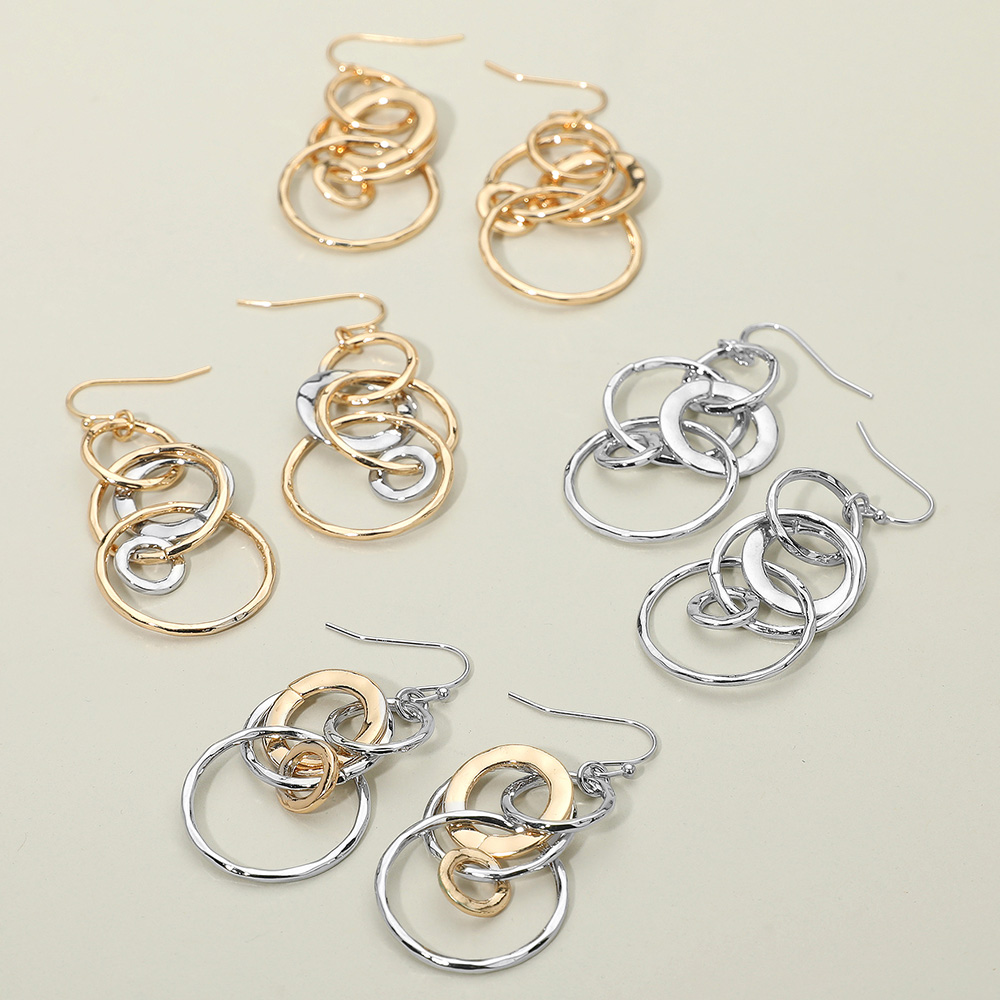 • Statement dangle earrings featuring interlinked hoops in a layered design. Lightweight yet bold, these earrings add a touch of contemporary flair to casual and dressy looks. Perfect for making a chic style statement with effortless elegance day or night.