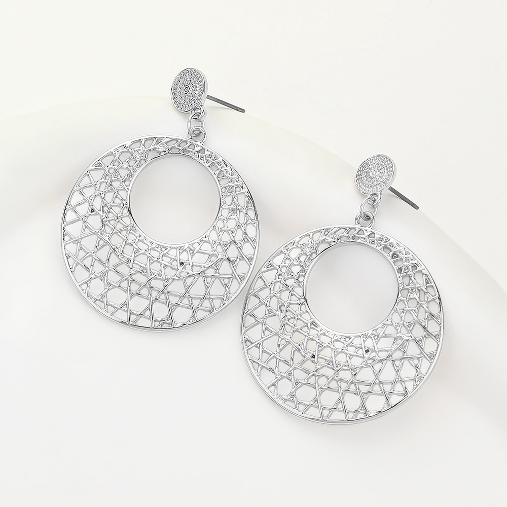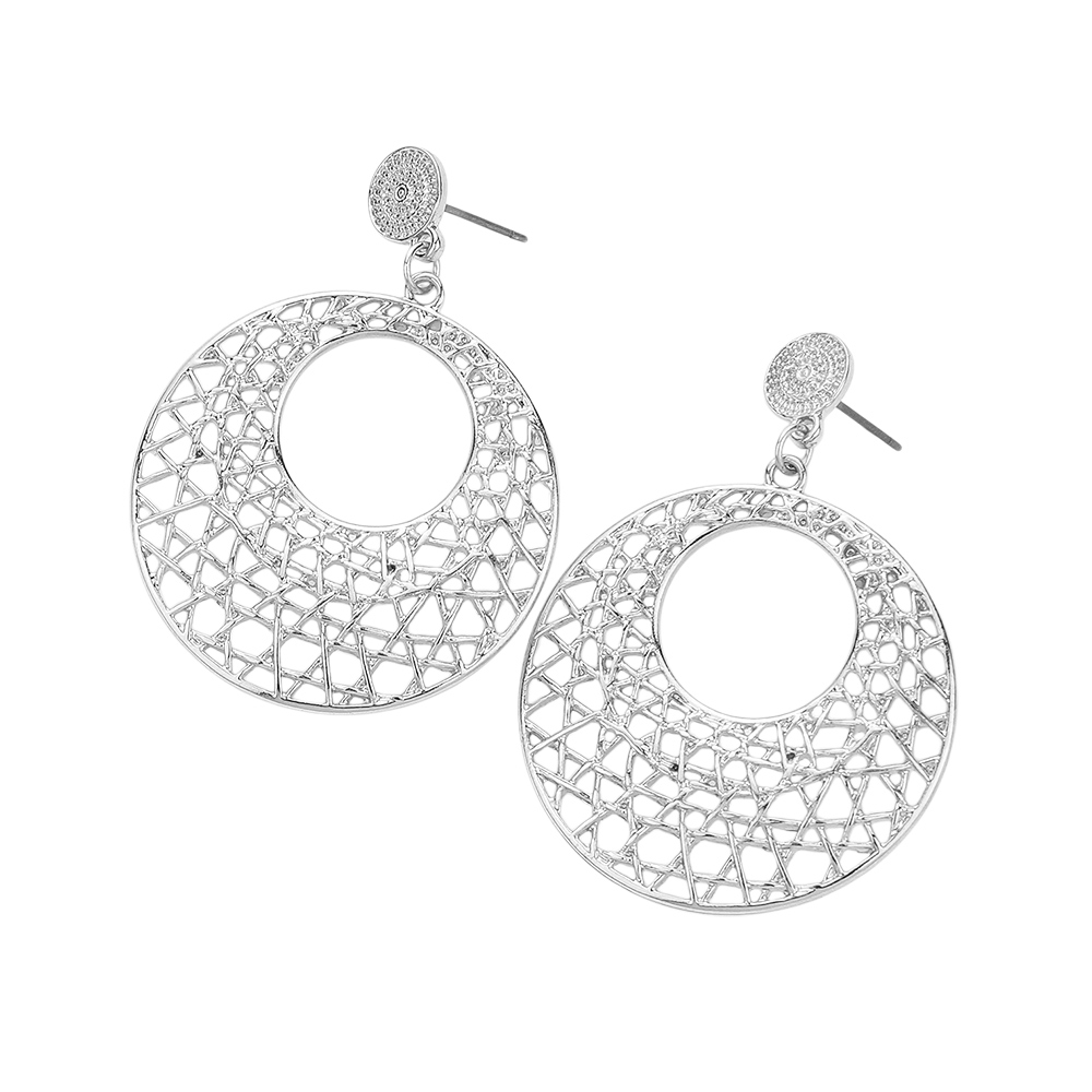 Details • Size : 1.3" X 2" • Post Back • Chic round cutout earrings with a delicate filigree design. These lightweight statement drops feature intricate openwork and a bold circular silhouette, perfect for elevating both casual and formal looks. • Lead and Nickel Compliant