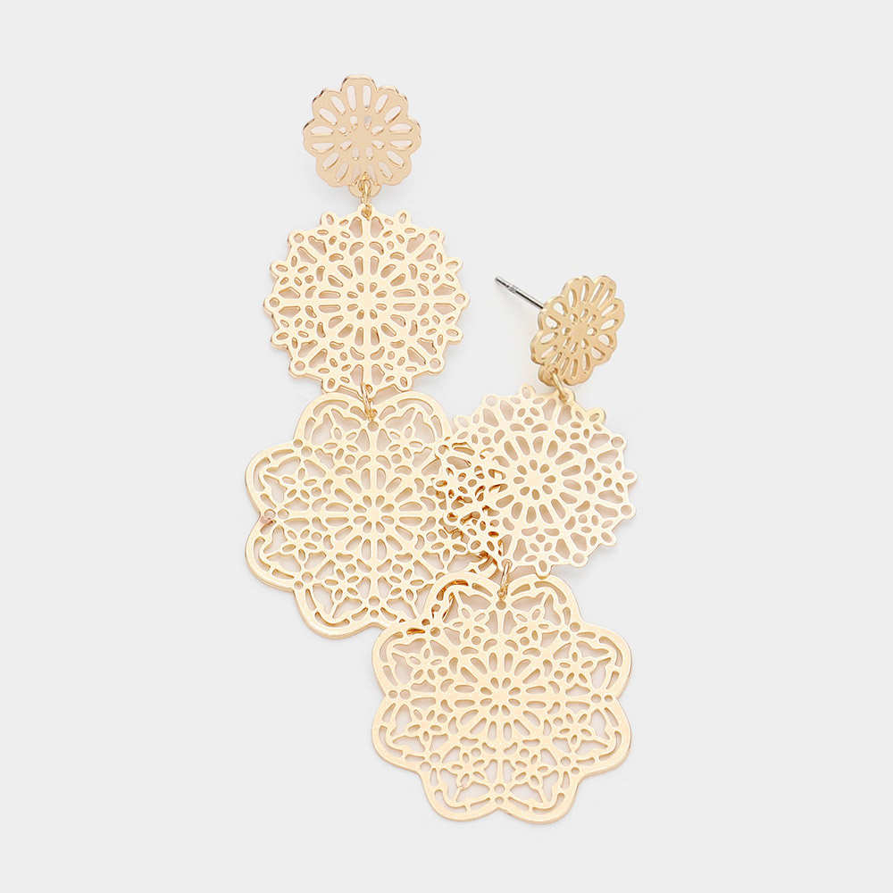 Triple Round Brass Metal Filigree Link Dropdown Dangle Earrings