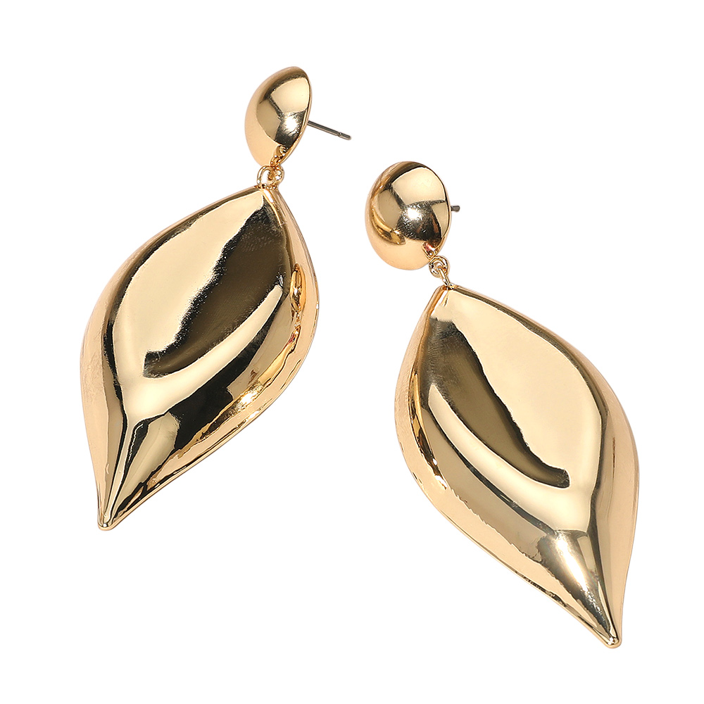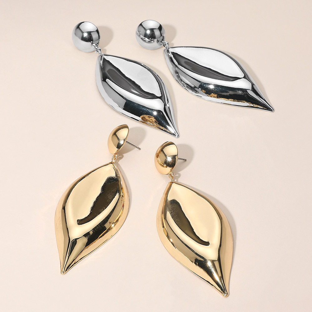 Details • Size : 1.25" X 3.5" • Post Back • Make a statement with these marquise-shaped dangle earrings featuring a sleek sculptural design and reflective finish. Ideal for casual or formal wear, they add modern sophistication to any look. Perfect for elevating everyday outfits or complementing evening ensembles. • Lead and Nickel Compliant