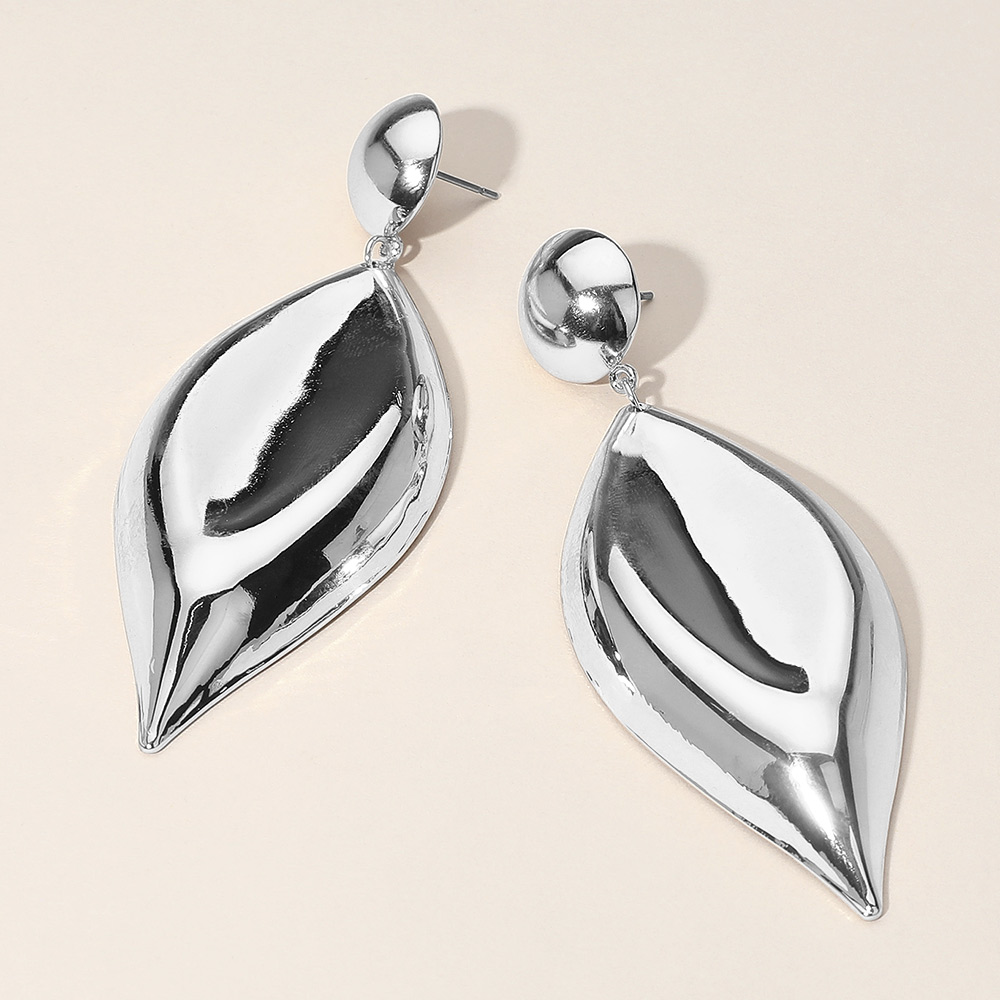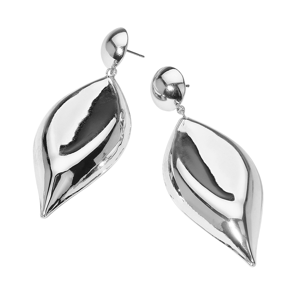 Details • Size : 1.25" X 3.5" • Post Back • Make a statement with these marquise-shaped dangle earrings featuring a sleek sculptural design and reflective finish. Ideal for casual or formal wear, they add modern sophistication to any look. Perfect for elevating everyday outfits or complementing evening ensembles. • Lead and Nickel Compliant
