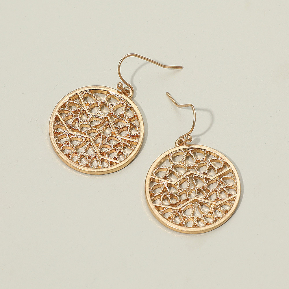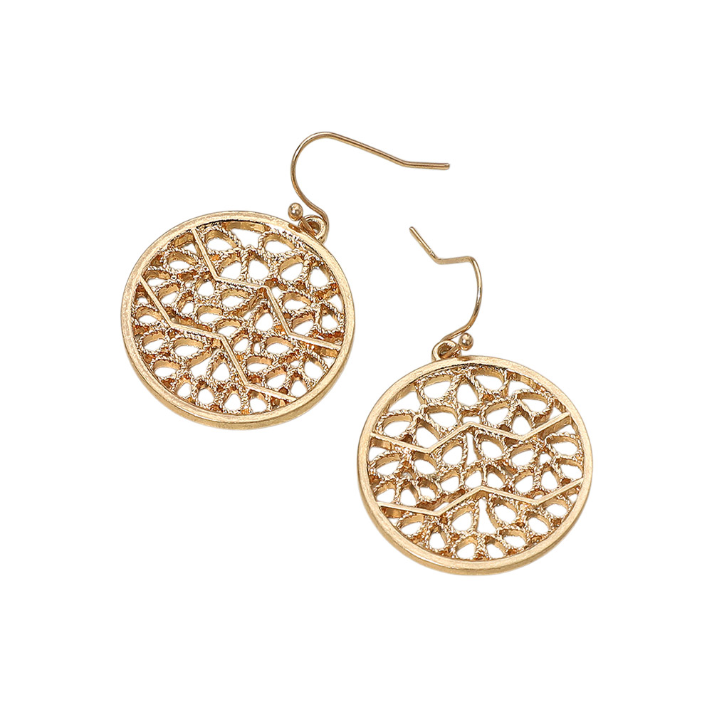 Details • Size : 1.9" X 2.6" • Fish Hook Back • Stylish round filigree dangle earrings with an intricate cutout pattern for a delicate yet eye-catching look. Lightweight and versatile, perfect for adding a touch of elegance to casual or dressy ensembles. • Lead and Nickel Compliant