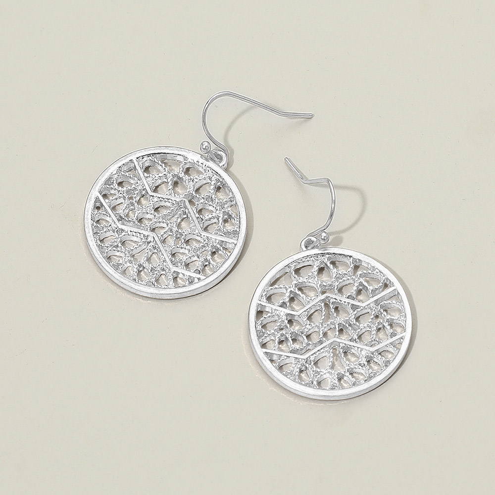 • Stylish round filigree dangle earrings with an intricate cutout pattern for a delicate yet eye-catching look. Lightweight and versatile, perfect for adding a touch of elegance to casual or dressy ensembles.