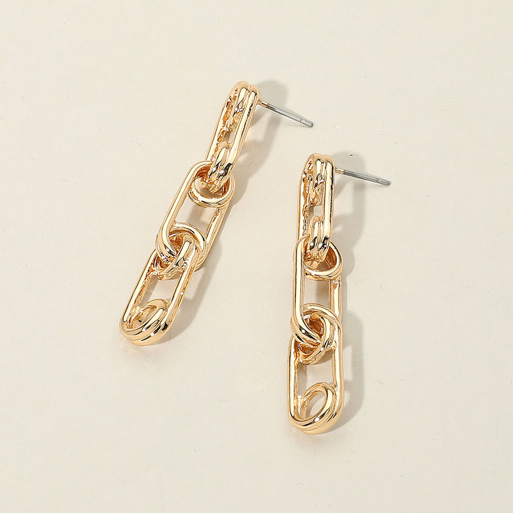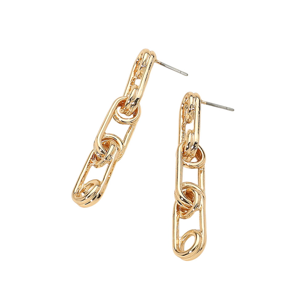 Details • Size : 0.3" X 2.1" • Post Back • Elevate your everyday look with these sleek chain link drop earrings. Featuring an elongated silhouette and interlocking loops, they offer a refined minimalist touch with subtle edge. Perfect for pairing with casual or polished outfits for effortless impact. • Gold Dipped