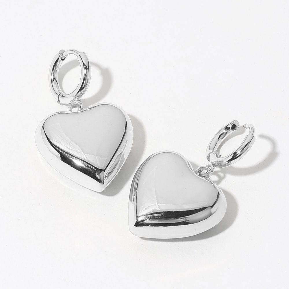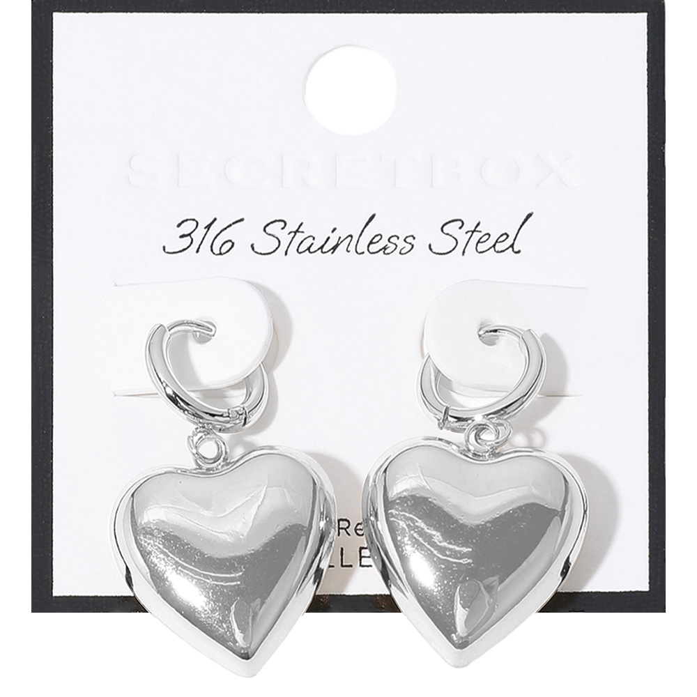 Details • Size : 0.75" X 1.25" • Huggie Back • Water Resistant • These earrings feature a bold heart-shaped drop suspended from a rounded hoop, offering a playful and romantic silhouette perfect for everyday charm or statement styling. • Hypoallergenic • Stainless Steel
