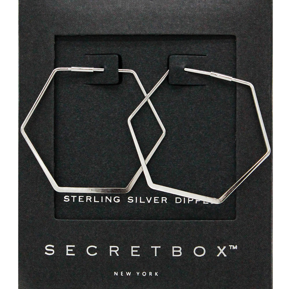 Details • Size : 1.5" X 1.25" • Endless Closure • Sleek hexagon hoop earrings from Secret Box New York, featuring a modern geometric design. Crafted with hypoallergenic metal and dipped in sterling silver for a clean, polished finish. • Sterling Silver Dipped