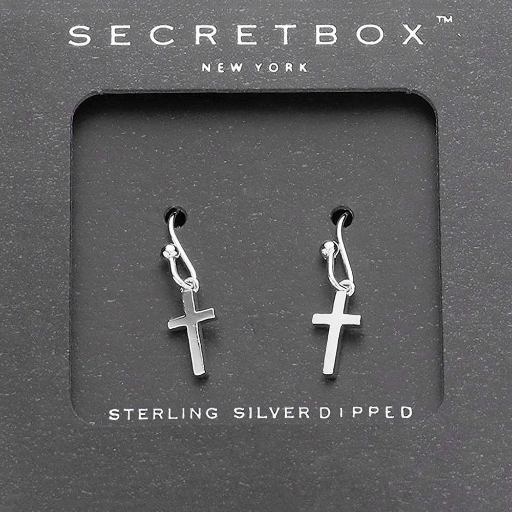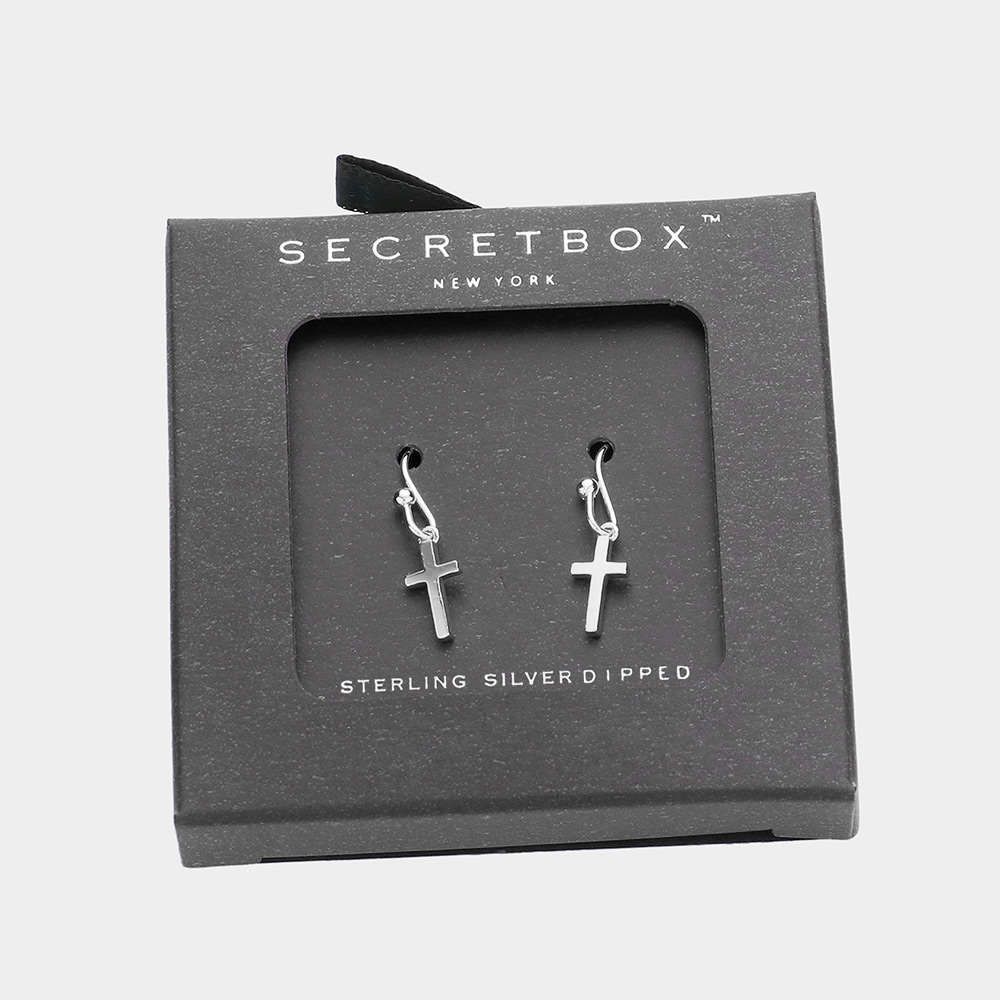 Details • Size : 0.25" X 0.75" • Fish Hook Back • Elegant cross drop earrings by Secret Box New York. Featuring a minimalist design, these hypoallergenic earrings are dipped in sterling silver, ideal for daily wear, special moments, or thoughtful gifts. • Lead and Nickel Compliant • Sterling Silver Dipped