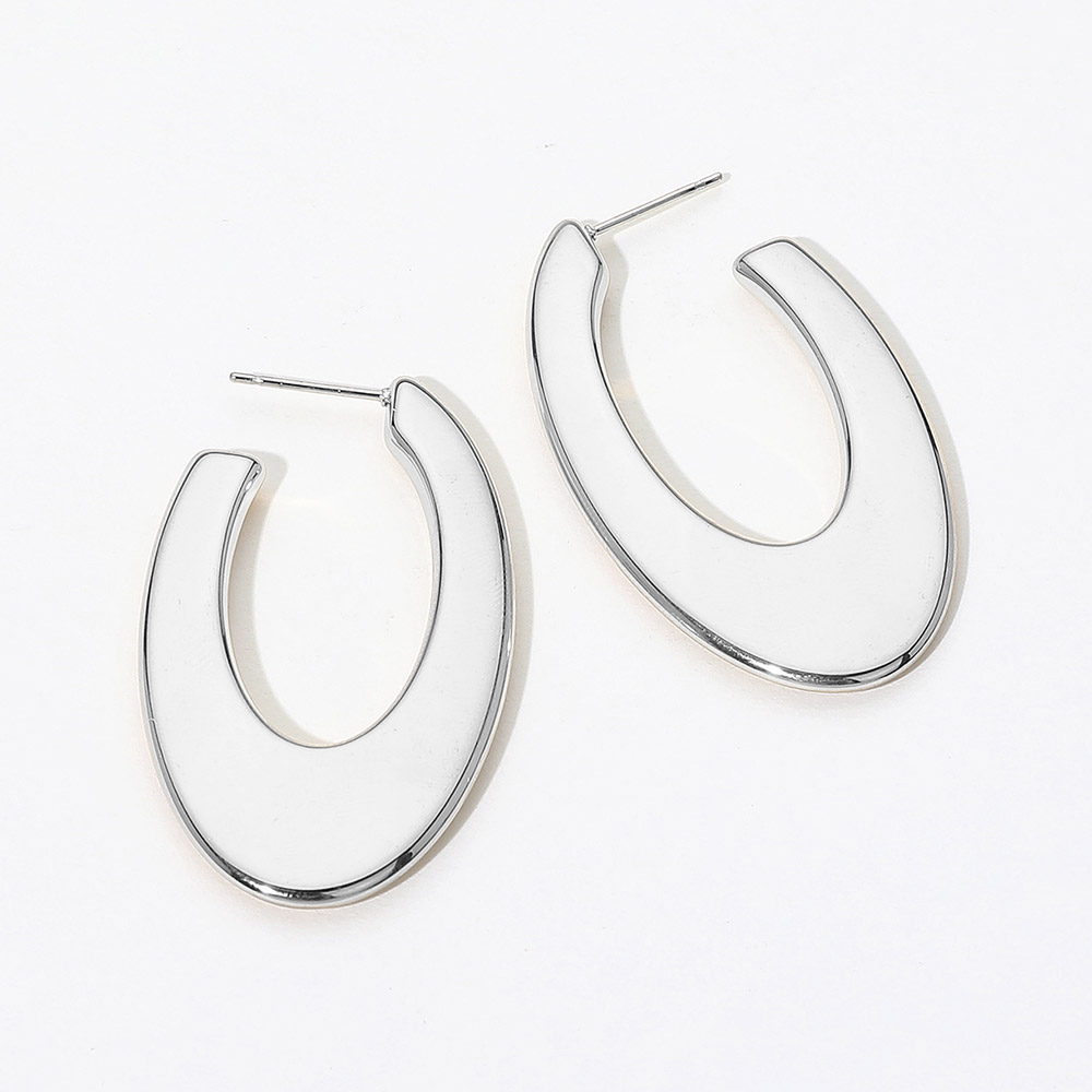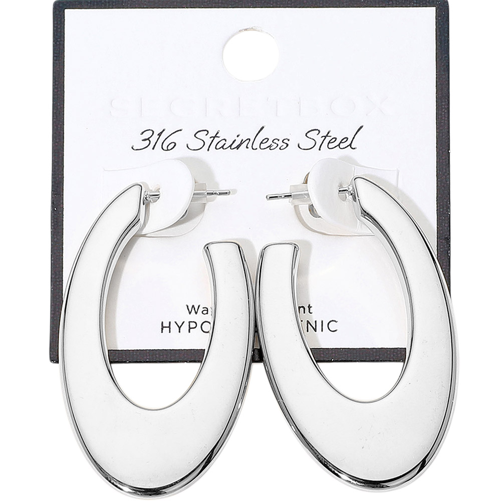Details • Size : 1.1" X 1.9" • Post Back • Water Resistant • Contemporary oval hoop earrings crafted from 316 stainless steel. Featuring a sleek, curved silhouette, these hypoallergenic, water-resistant studs add a bold and modern statement to any look. • Hypoallergenic • Lead and Nickel Compliant