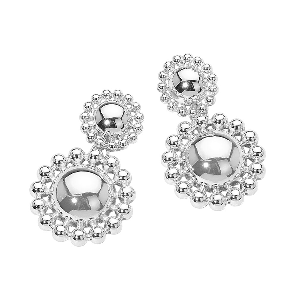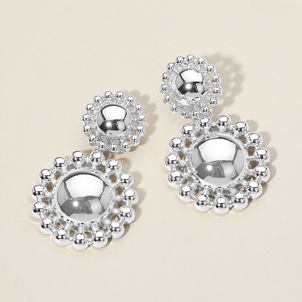 • Elevate your look with these double cluster drop earrings featuring a radiant, rounded silhouette framed by textured detailing. Their eye-catching design brings a touch of elegance to both casual and dressy outfits, making them a standout accessory for any occasion.