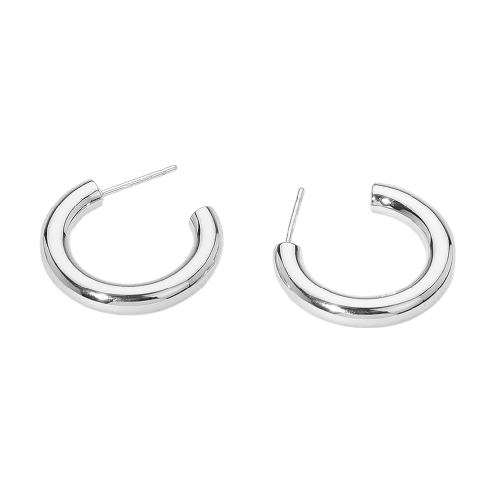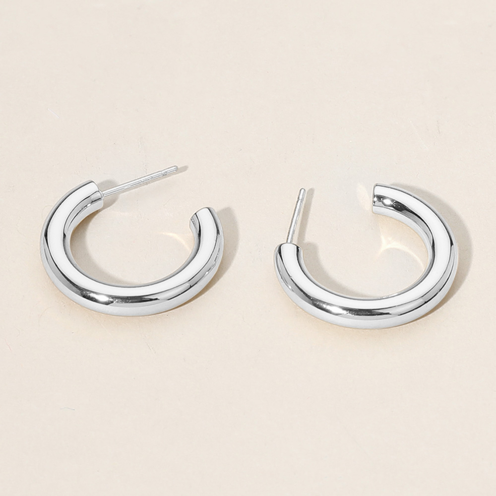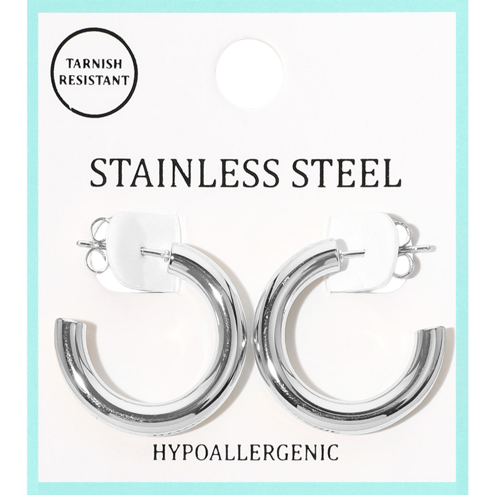 Details • Size : 0.8" X 0.8" X 0.2" • Post Back • Elegant stainless steel bold hoop earrings with a modern, rounded design. Hypoallergenic and tarnish-resistant, perfect for everyday comfort and adding a polished statement to any outfit. • Hypoallergenic • Stainless Steel