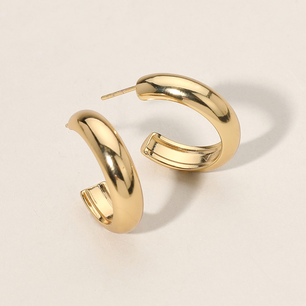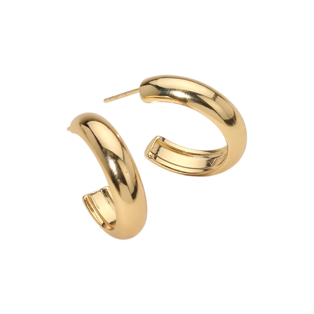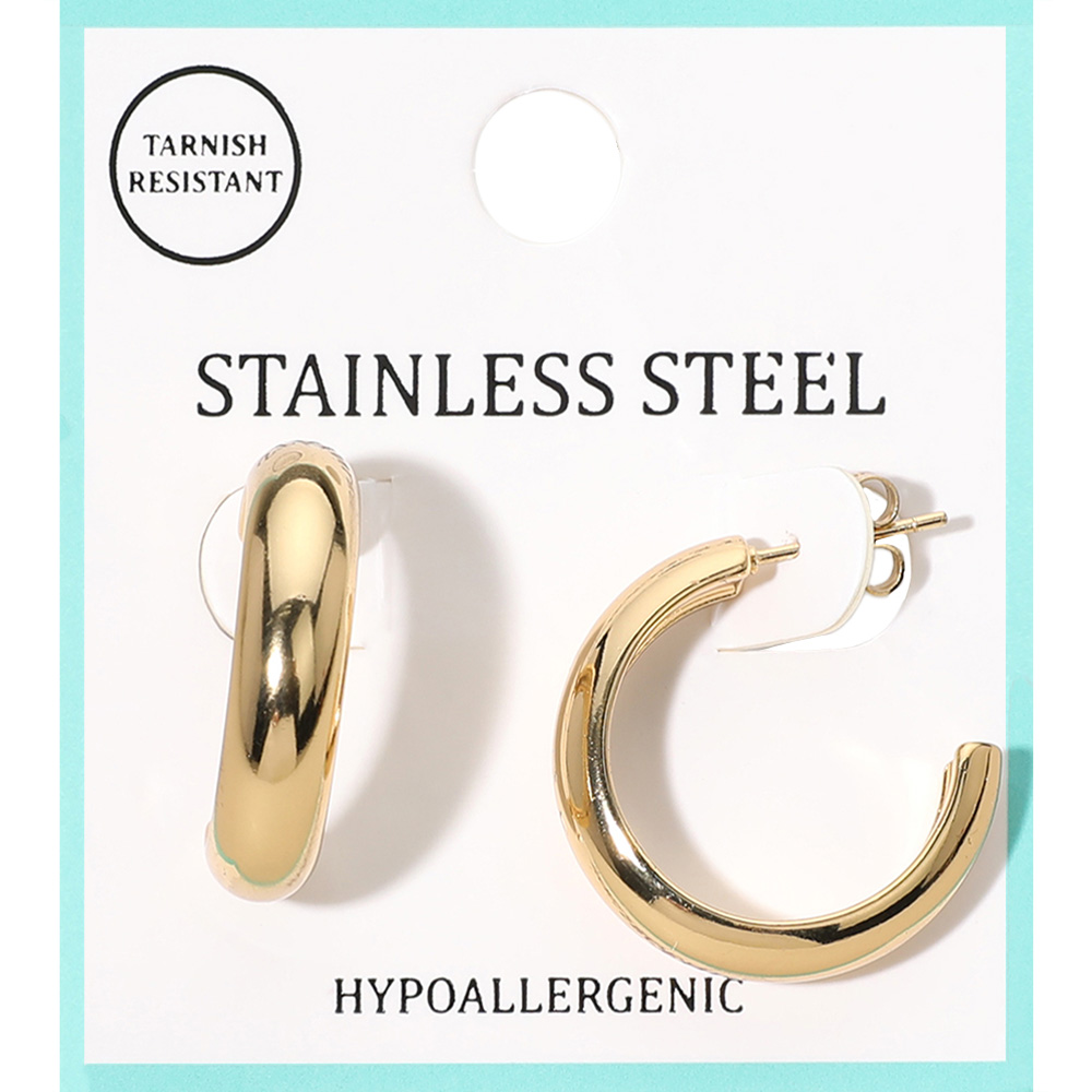 Details • Size : 1" X 1" X 0.25" • Post Back • Stylish stainless steel thick hoop earrings with a sleek design. Hypoallergenic and tarnish-resistant, offering comfort for sensitive skin and a modern touch for both casual and formal wear. • Hypoallergenic • Stainless Steel