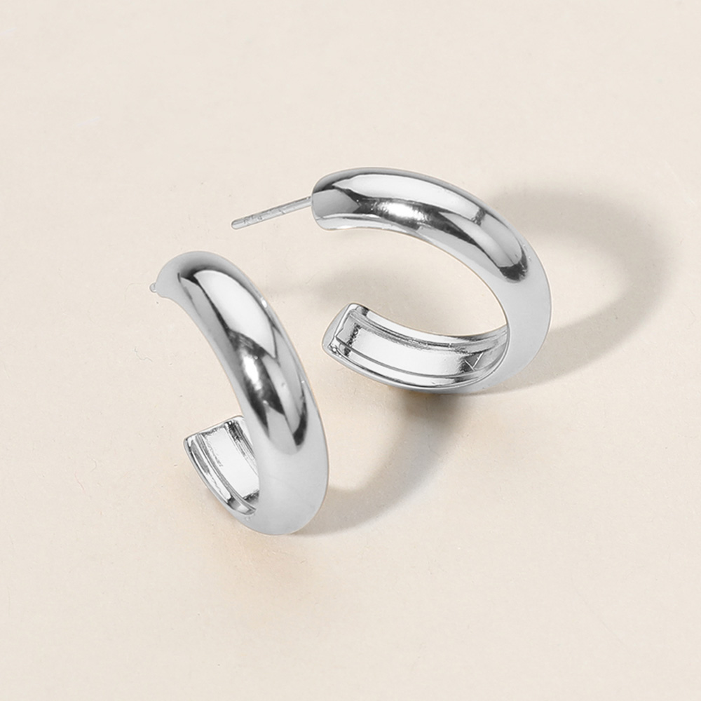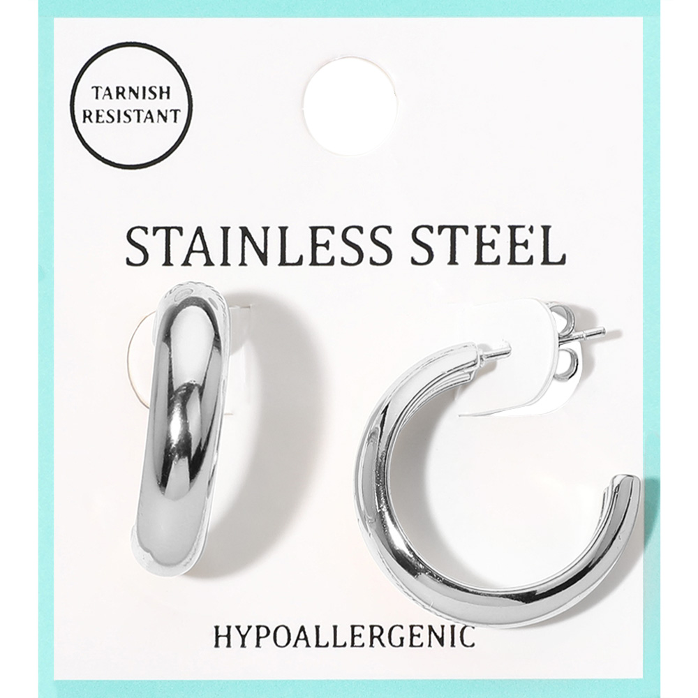 Details • Size : 1" X 1" X 0.25" • Post Back • Stylish stainless steel thick hoop earrings with a sleek design. Hypoallergenic and tarnish-resistant, offering comfort for sensitive skin and a modern touch for both casual and formal wear. • Hypoallergenic • Stainless Steel