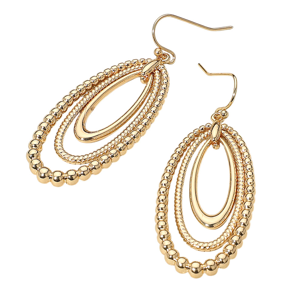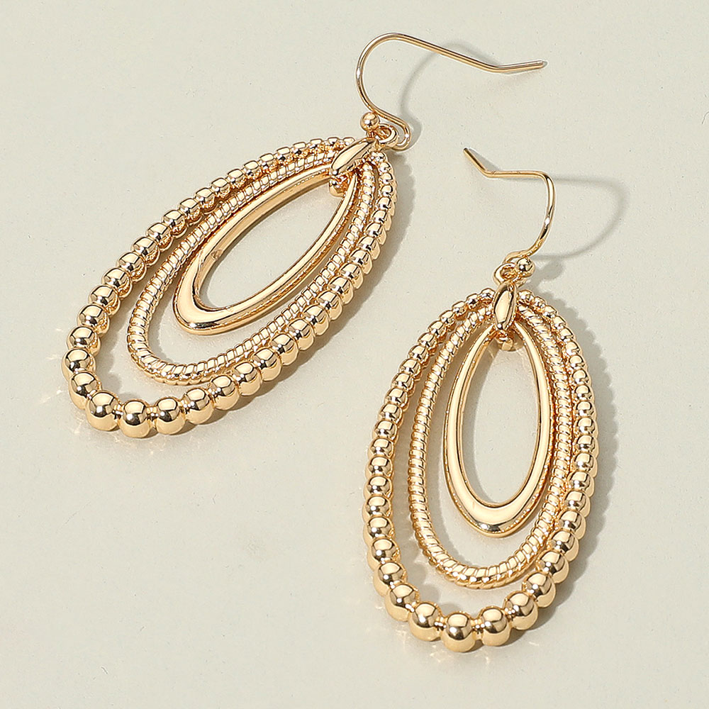 Details • Size : 0.8" X 2.25" • Fish Hook Back • Elegant layered oval drop earrings featuring multiple open oval shapes with smooth and textured bead accents. Lightweight and stylish, these earrings add a refined, modern flair to any outfit, making them perfect for both casual outings and special occasions. • Lead and Nickel Compliant