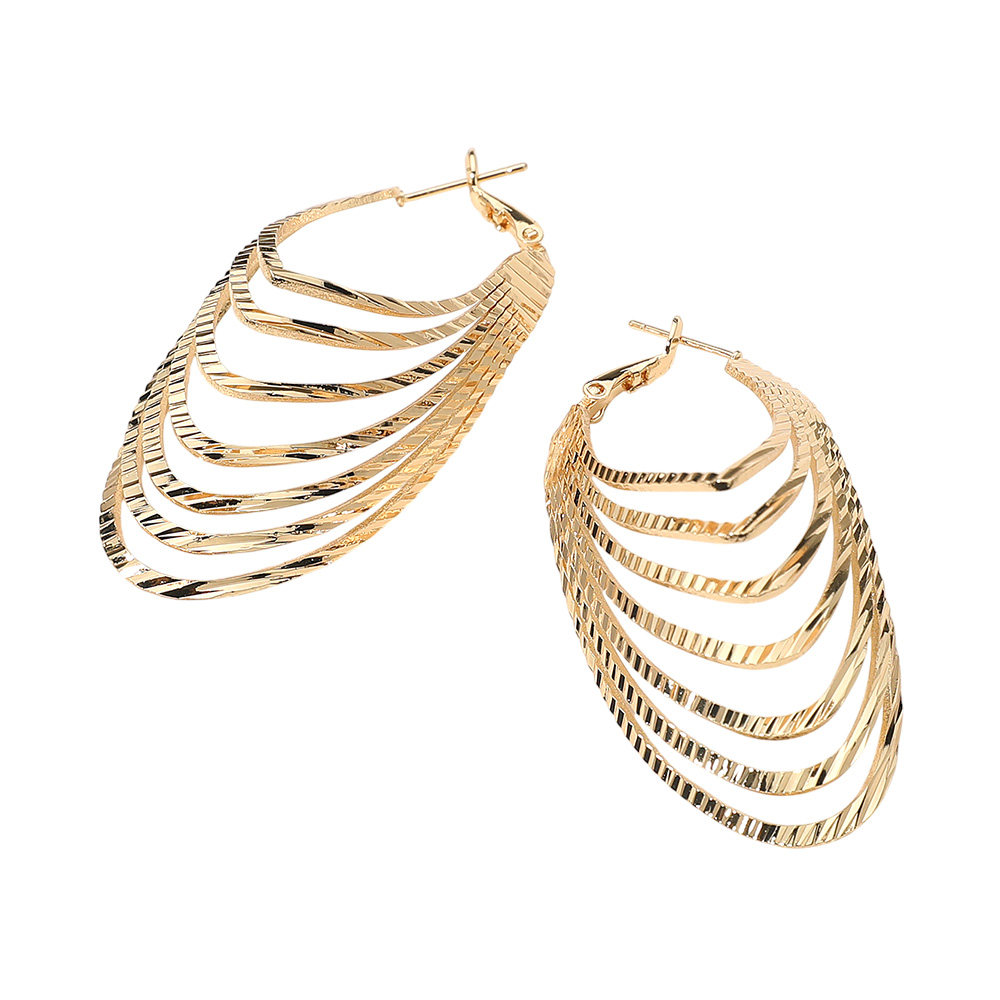 Details • Size : 1.24" X 2.1" • Omega Back • Elevate your look with these striking Layered Oval Hoop Earrings. These eye-catching hoops feature a stacked, cascade design with five individual, interlocking layers that create a brilliant statement dangle. Each layer boasts a finely textured, ridged finish that catches the light beautifully, adding dimension and shimmer. The large, yet lightweight, design makes them perfect for parties, nights out, or adding a dose of dramatic style to your everyday wear. • Lead and Nickel Compliant