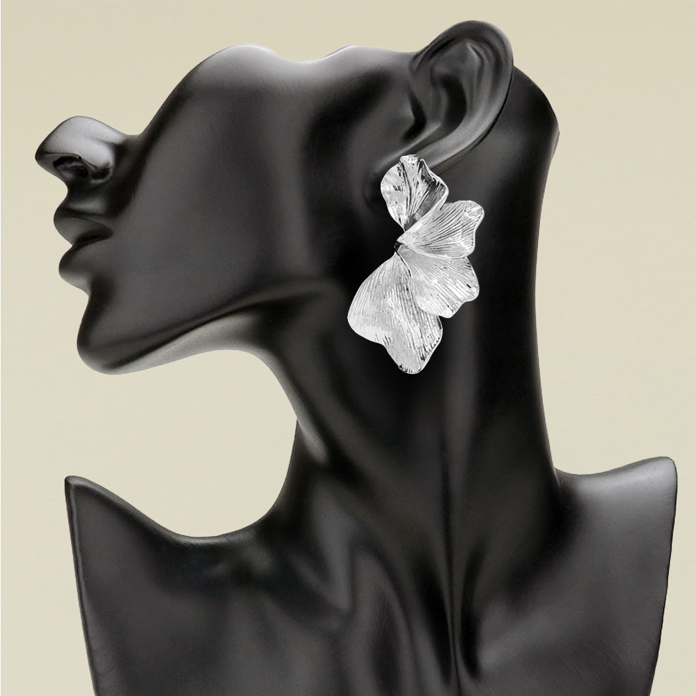 Textured Metal Leaf Petal Drop Statement Earrings Textured Metal Leaf Petal Drop Statement Earrings