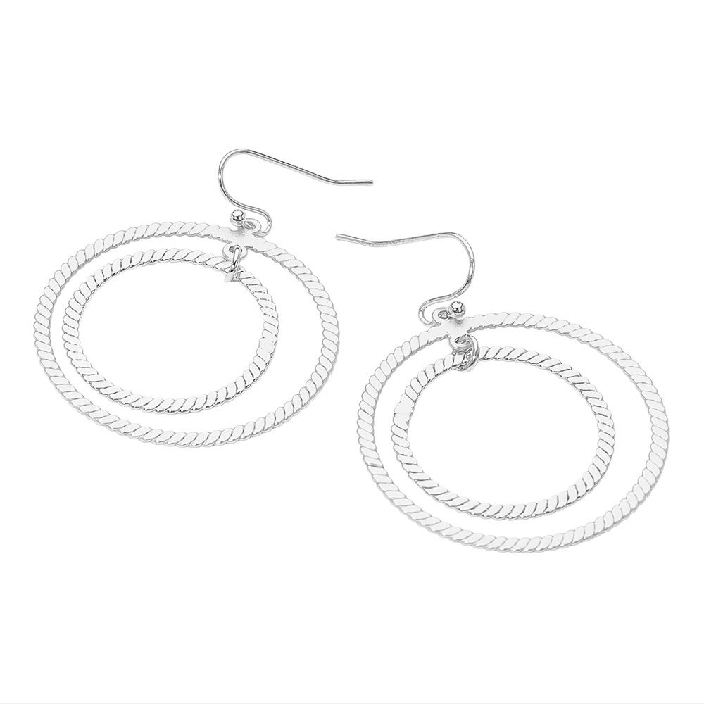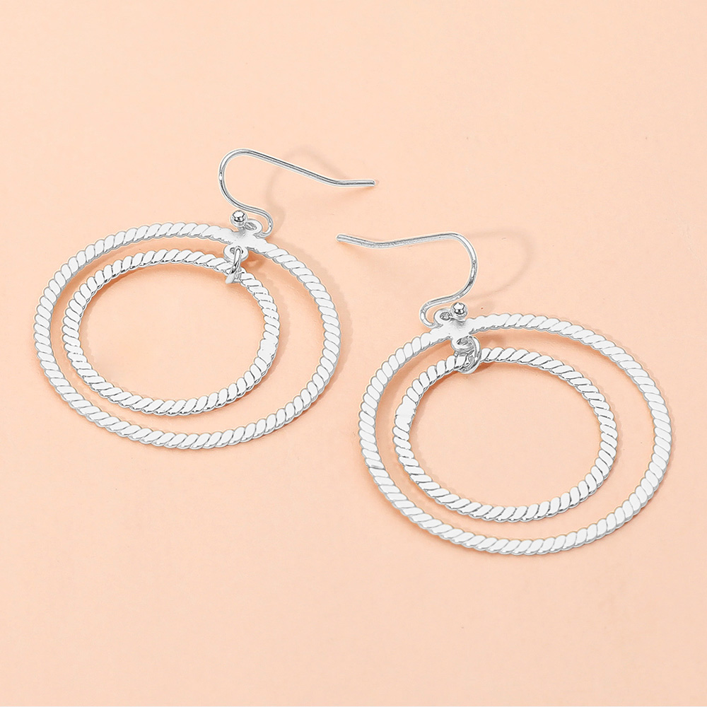 Details • Size : 1.4" X 1.75" • Fish Hook Back • Chic double hoop dangle earrings featuring a textured finish and lightweight design. A versatile accessory that adds a stylish touch to everyday outfits or special occasion looks. • Lead and Nickel Compliant