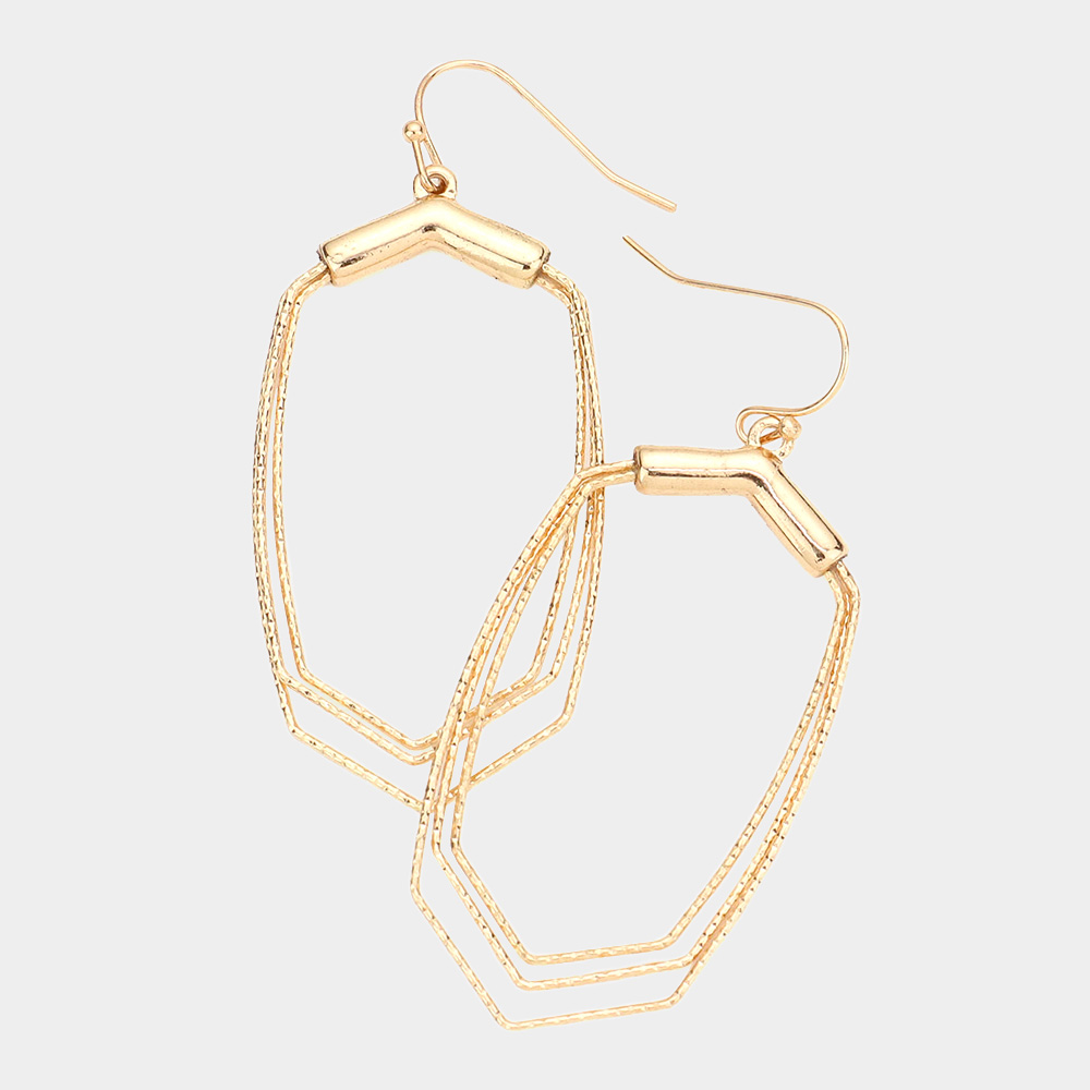 Textured Metal Triple Wire Open Hexagon Dangle Earrings