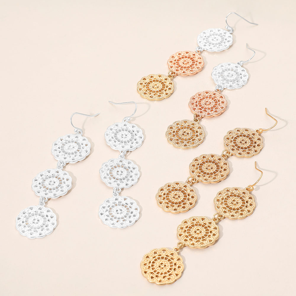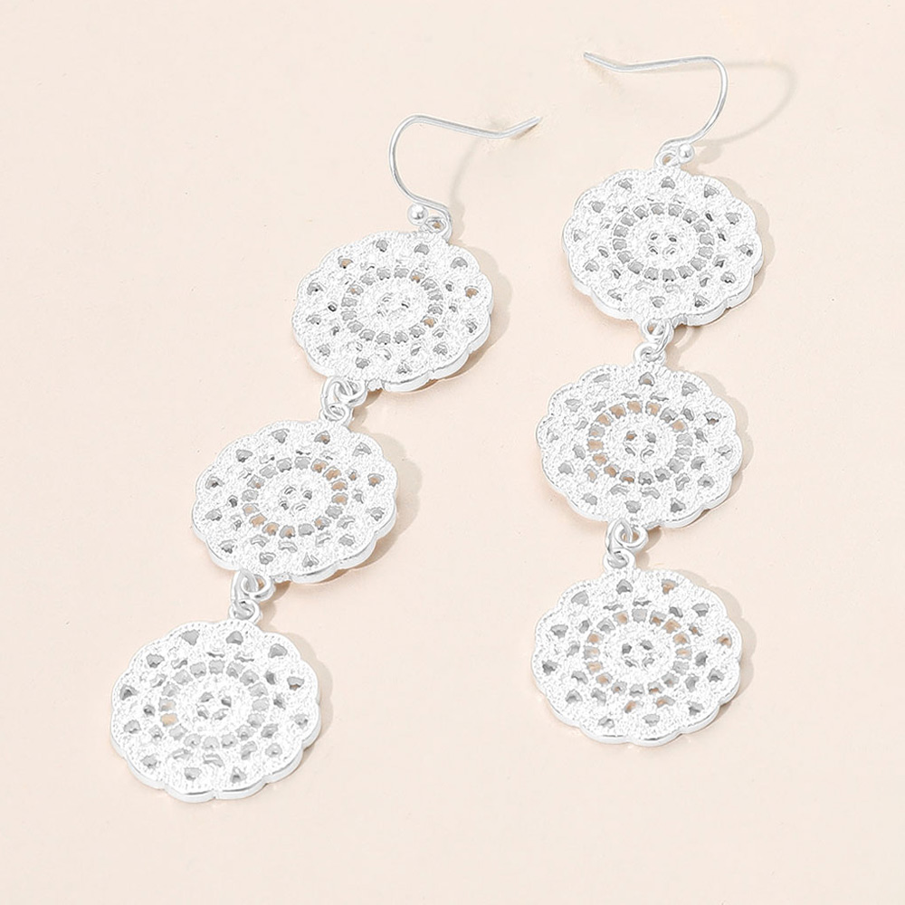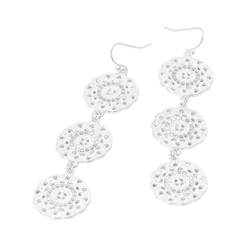Details • Size : 0.8" X 3.3" • Fish Hook Back • Elegant dangle earrings featuring three intricately patterned discs in a cascading drop design. Inspired by lace detailing, these statement earrings add a touch of vintage charm to any outfit, ideal for special events or everyday flair. • Lead and Nickel Compliant