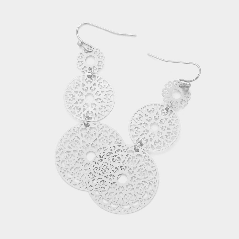 Triple Round Brass Metal Filigree Link Dropdown Dangle Earrings