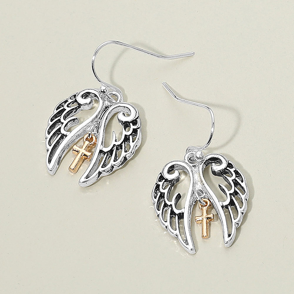 Details • Size : 0.75" X 1.25" • Fish Hook Back • Celebrate faith and protection with these angel wing earrings featuring a delicate cross charm. A meaningful blend of beauty and spirituality, these earrings are perfect for daily wear or as a heartfelt gift, symbolizing hope, strength, and divine guidance. • Lead and Nickel Compliant