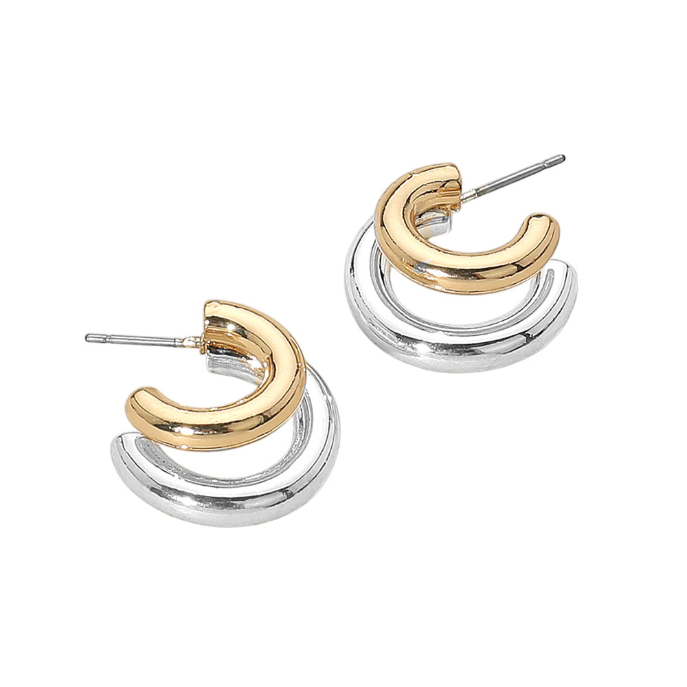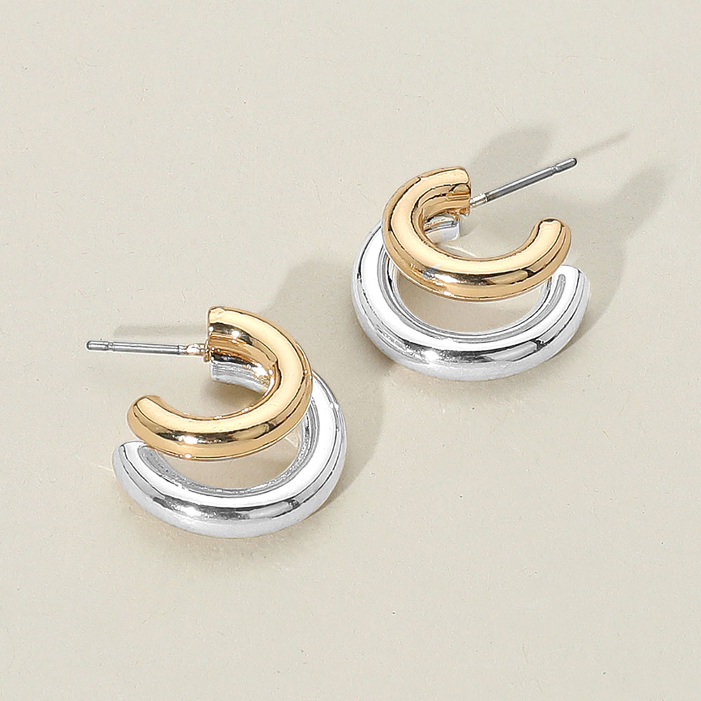Details • Size : 1" X 0.8" • Post Back • Earrings featuring dual crescent-shaped open hoops in a layered and overlapping design. Sleek, sculptural curves offer a bold yet elegant silhouette for any occasion. • Lead and Nickel Compliant