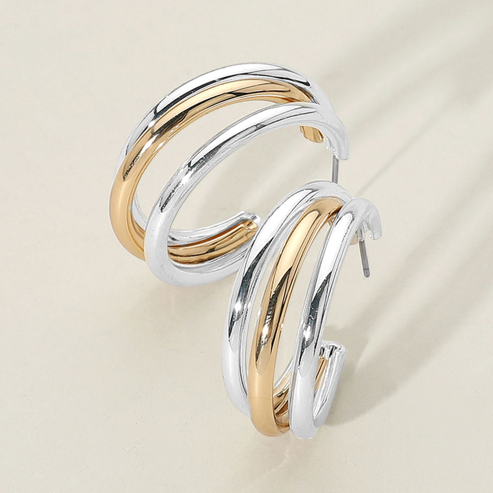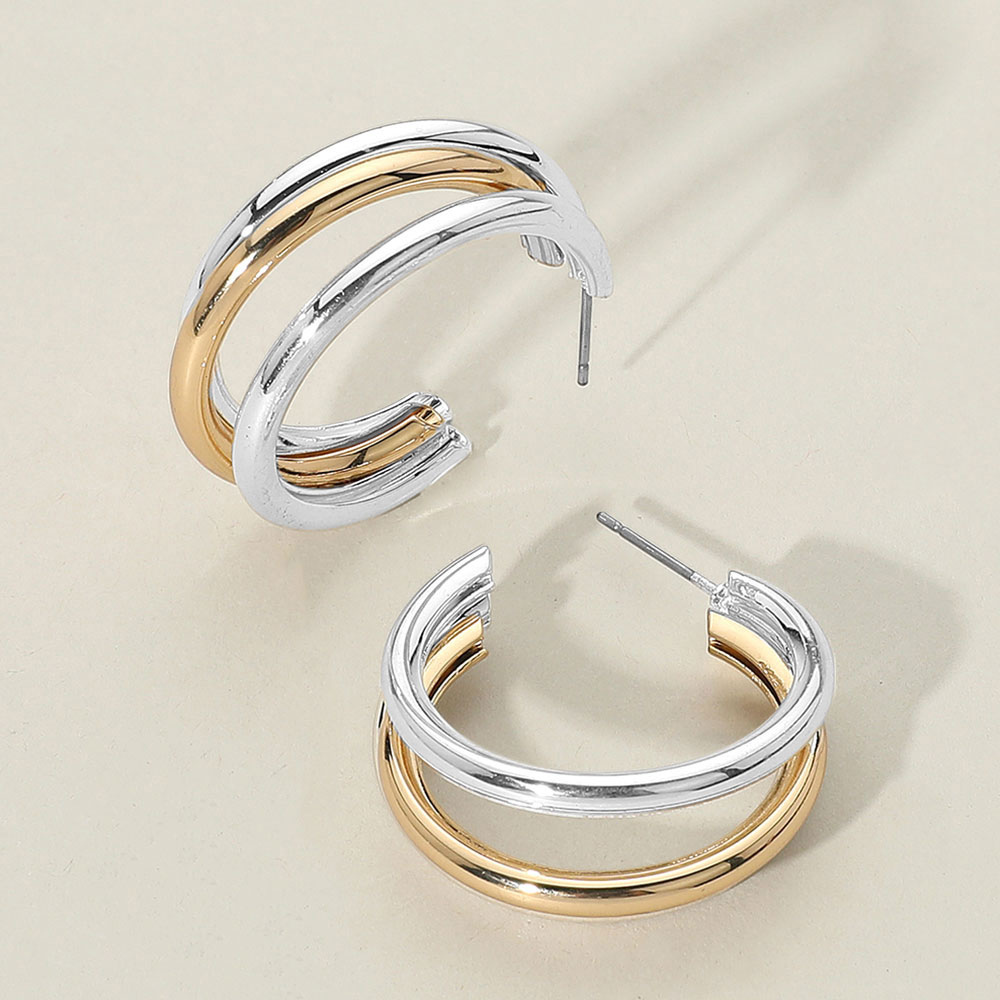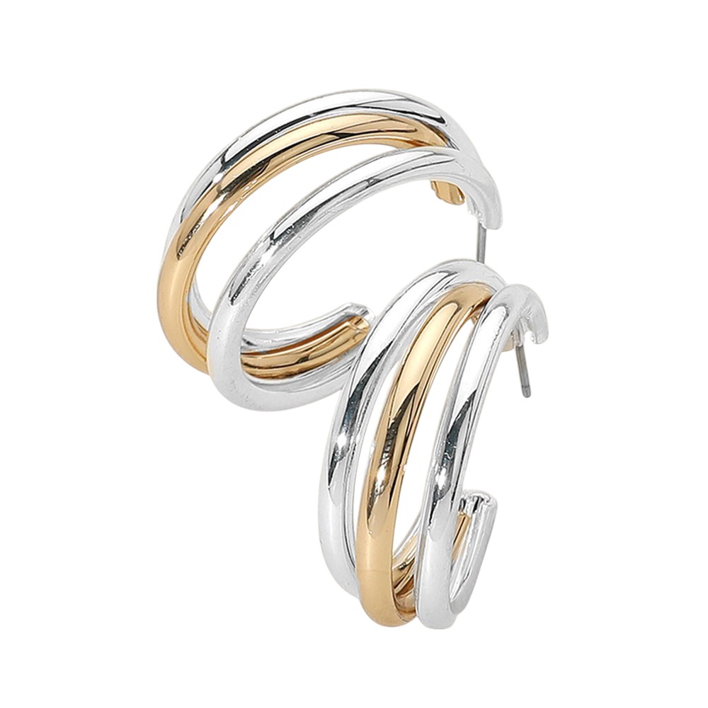 Details • Size : 1.4" X 1.25" • Post Back • Modern hoop earrings featuring a layered design with curved overlapping bands. The sleek, open form adds dimension and a bold finish to any look. • Lead and Nickel Compliant