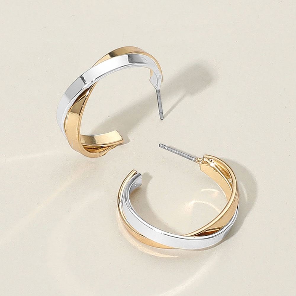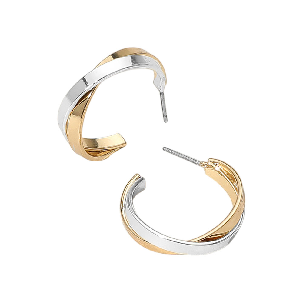 • Classic hoop earrings with a modern twist design in a two-tone finish. Lightweight and versatile, perfect for adding a polished touch to day or evening looks. Secure post backs for comfortable wear.