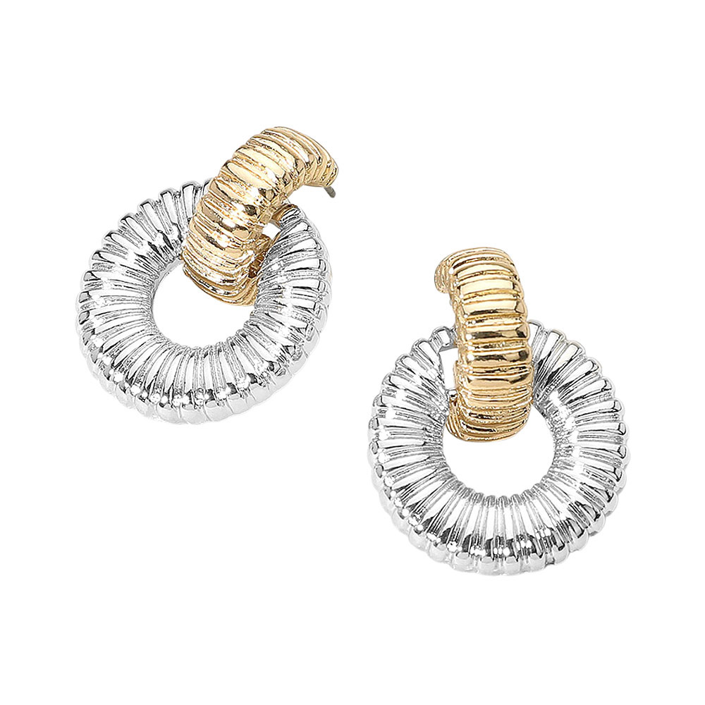 Details • Size : 1" X 1.25" • Post Back • Elevate your accessory game with these dual-tone textured circle earrings. Their sculpted design and interlocking loops create a bold yet elegant statement, perfect for adding modern sophistication to both casual and dressy looks. • Lead and Nickel Compliant