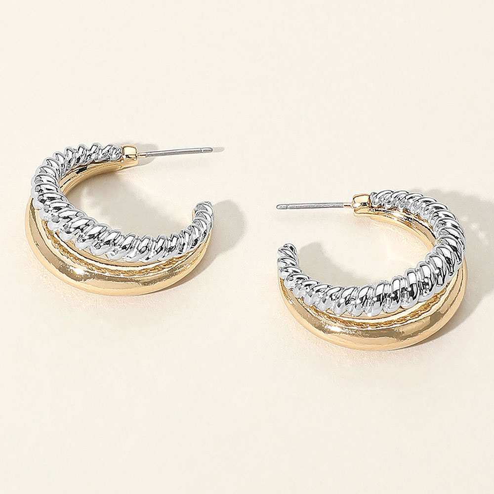 Details • Size : 1" X 1" X 0.5" • Post Back • Add a modern twist to your look with these textured dual-tone hoop earrings. Their elegant blend of smooth and braided detailing brings dimension and shine, making them a perfect accessory for both everyday wear and sophisticated evening styles. • Lead and Nickel Compliant
