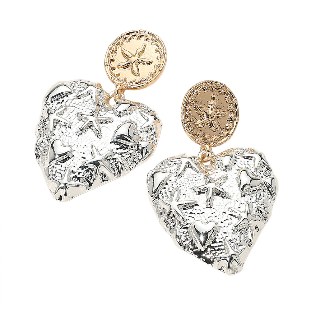 Two Tone Textured Metal Sand Dollar Pointed Starfish Embossed Heart Dangle Earrings