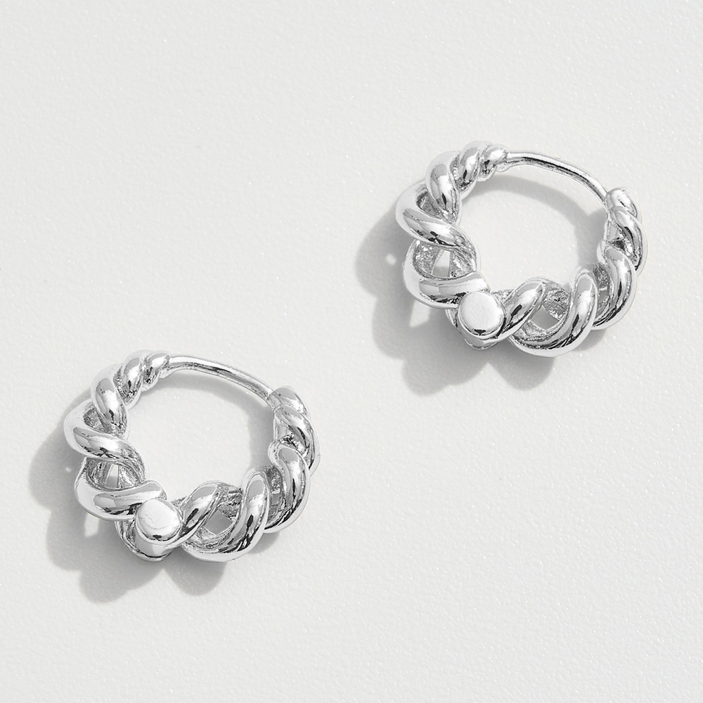 Details • Size : 0.5" X 0.5" • Huggie Back • These twisted hoop earrings feature an interwoven design that blends edge with elegance. Their sculptural form creates a bold yet refined look, perfect for elevating everyday outfits or adding a statement touch to evening ensembles. • Brass • Gold Dipped • Hypoallergenic • Lead and Nickel Compliant • Made In Korea