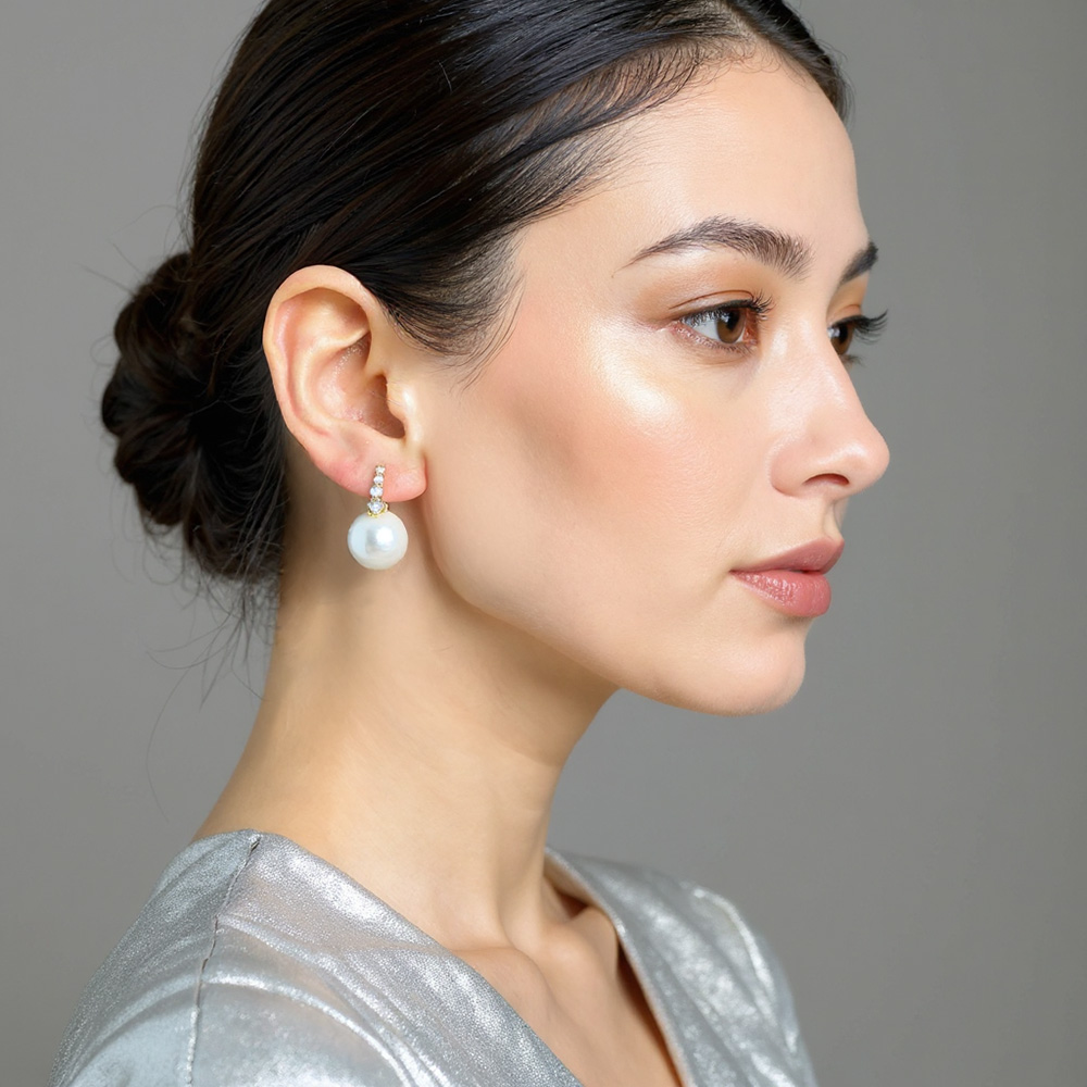 Details • Size : 0.7" X 1" • Hugie Back • These graceful drop earrings feature a lustrous pearl suspended from a line of sparkling stones, blending timeless charm with modern elegance. Perfect for weddings, evening events, or everyday sophistication, they add a refined touch to any jewelry collection. • Brass • CZ Cubic Zirconia • Gold Dipped • Hypoallergenic • Lead and Nickel Compliant • Made In Korea
