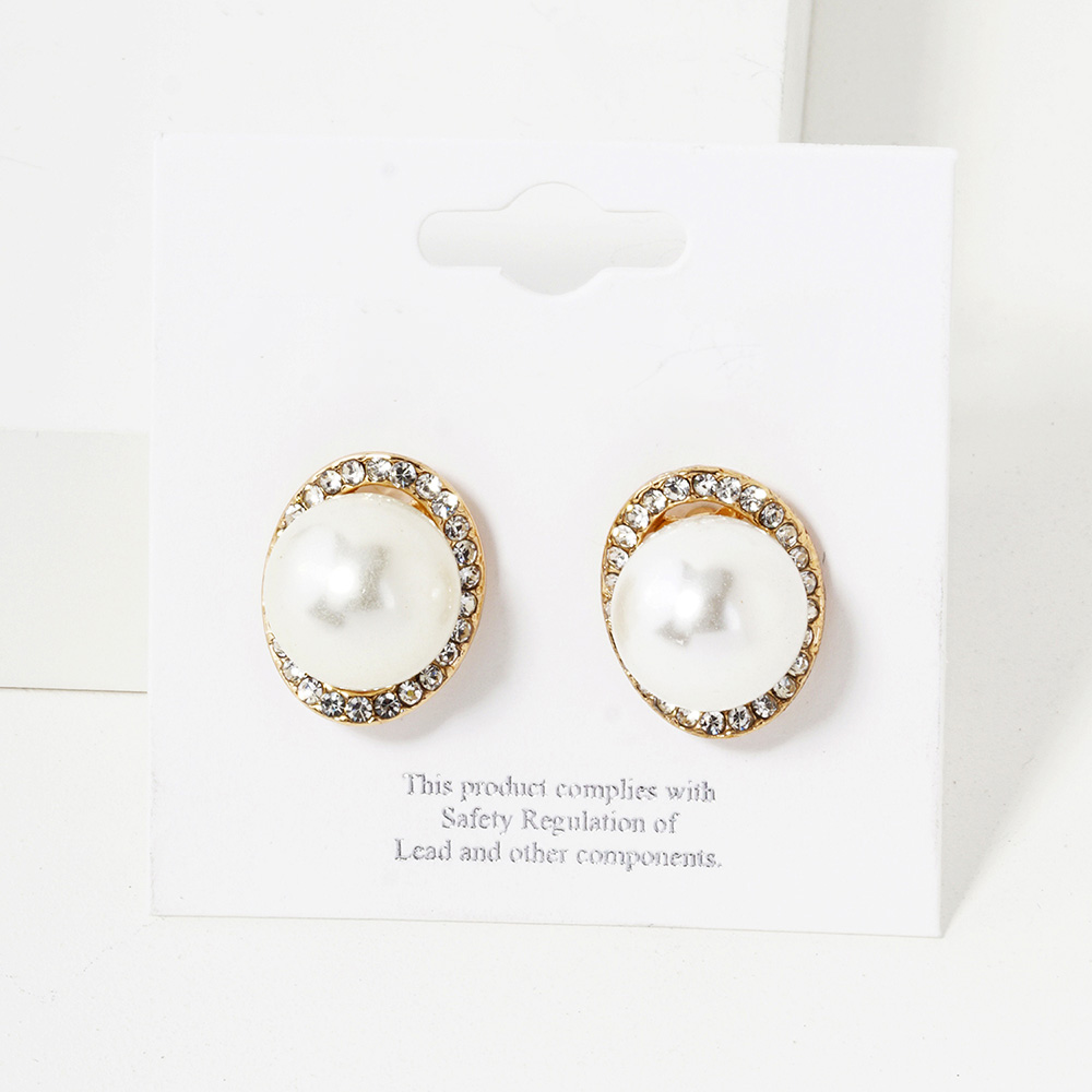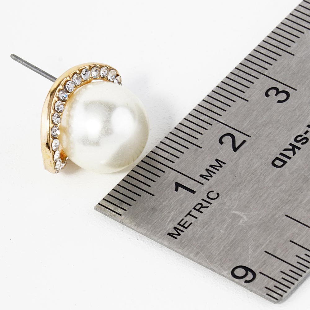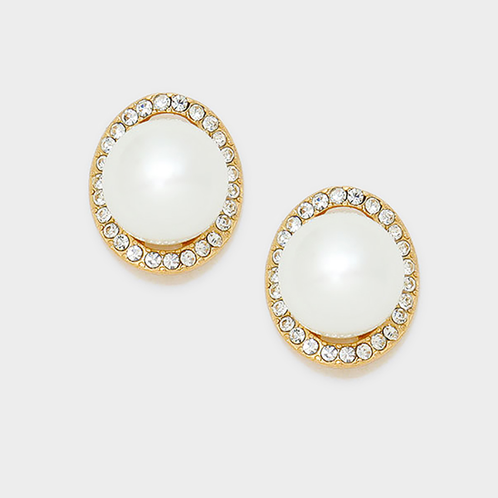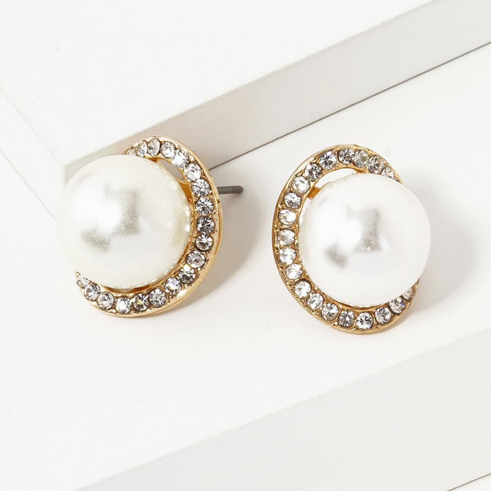 Details • Size : 0.6" X 0.7" • Post Back • Chic round stud earrings featuring a lustrous centerpiece framed by a halo of sparkling crystals. Designed for timeless elegance, these versatile studs add a touch of glamour to any outfit, making them perfect for both everyday wear and special occasions. • Lead and Nickel Compliant